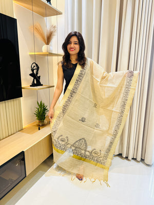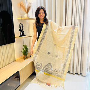 Madhubani Hand-painted Cotton Silk Dupatta - Beige