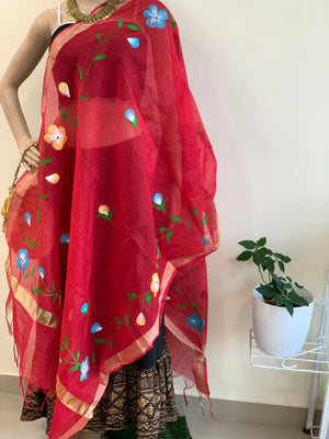 If you like floral patterns and would like a light weight dupatta to add to your collection, you've got a good find. Hand-painted in brigh colours, this cotton silk dupatta is an easy choice to brighten your outfit.
