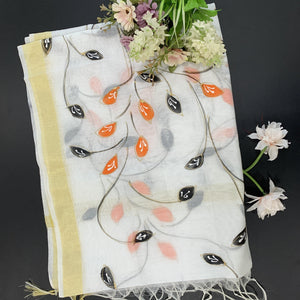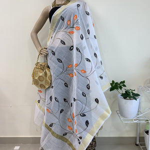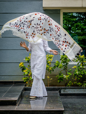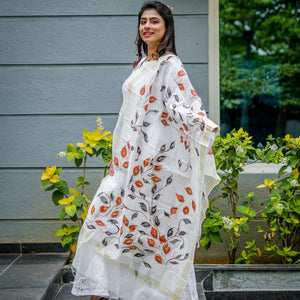Simple, beautiful and sophisticated hand-painted dupatta for all functions on a simple white base and golden zari border. It is made on cotton silk fabric with beautiful brown, black and gold leaves painted. Club it with your kurta set for a complete look.