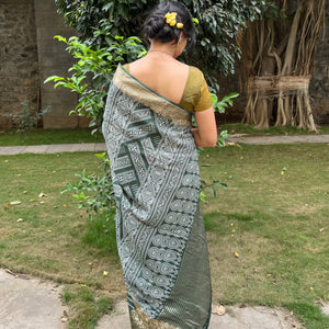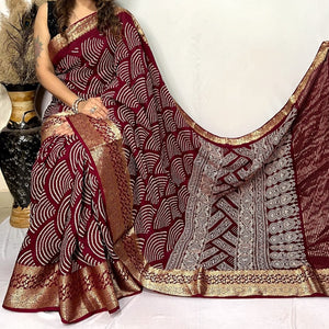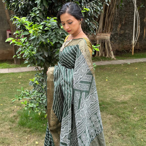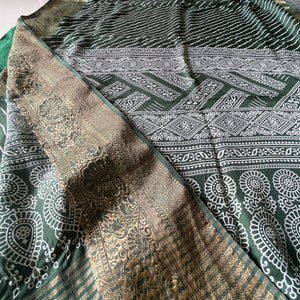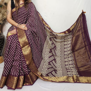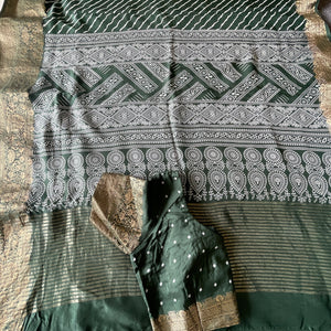 Dole Silk Ajrakh Saree is ideal for an attractive look. This exquisite Ajrakh has Digital Patola print with beautiful Leheriya design all over. The saree has an exquisite Zari pallu.
