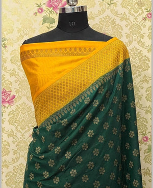 This beautiful duping silk saree has embossed golden jari all over, and a lovely shine, and makes for a smart ethnic look. It has an intricate butti design all over and a contrast border and pallu. Handcrafted by artisans of Banaras.