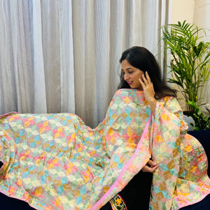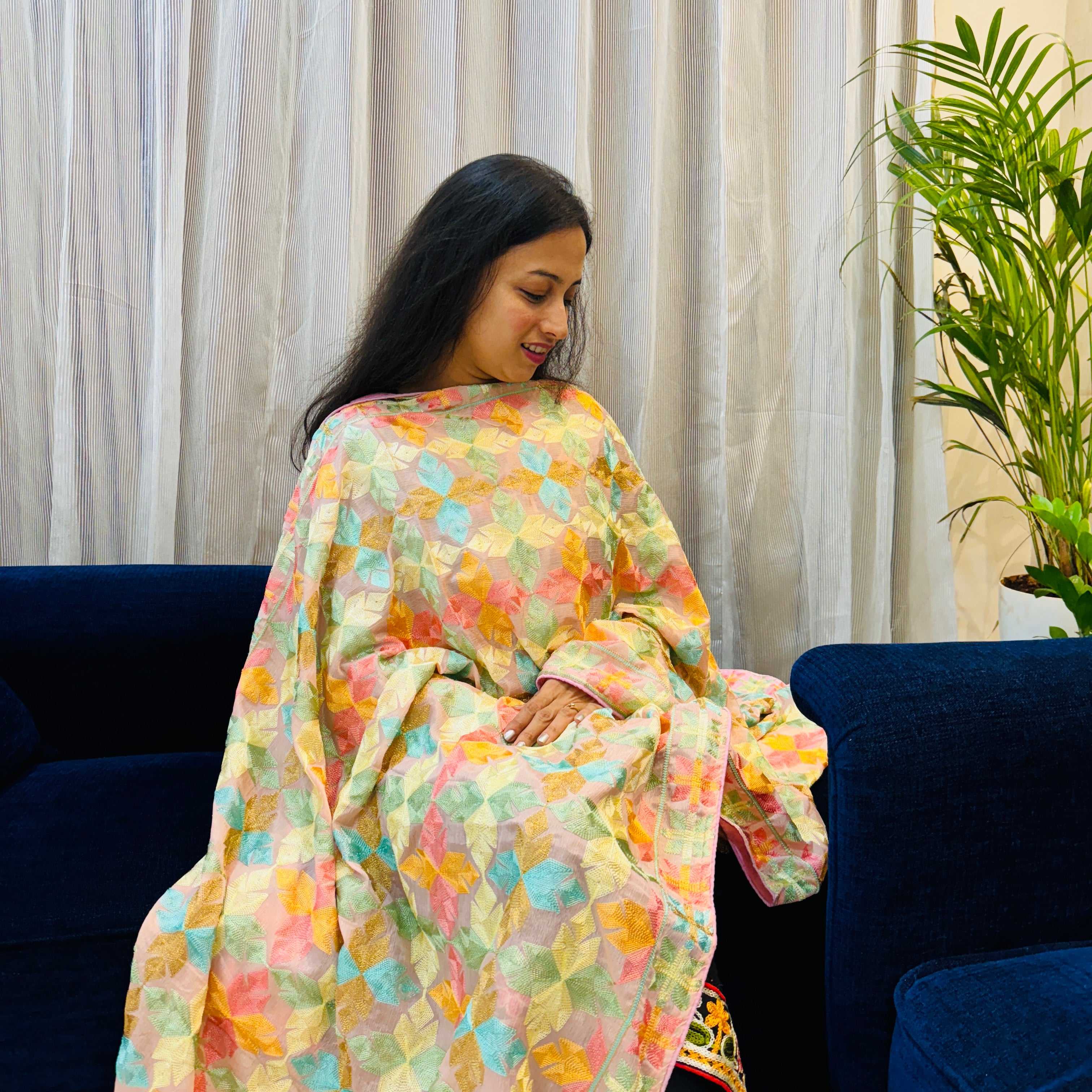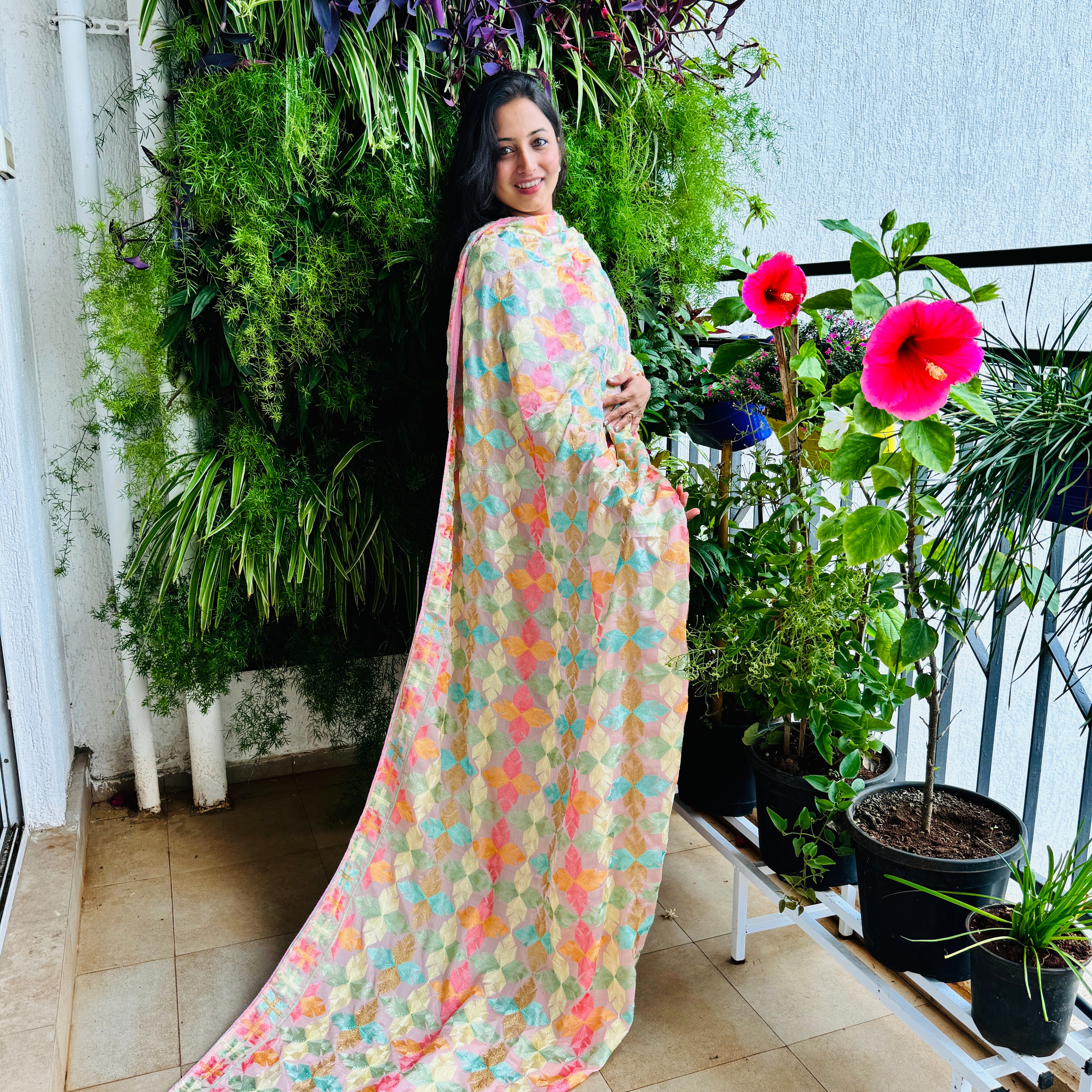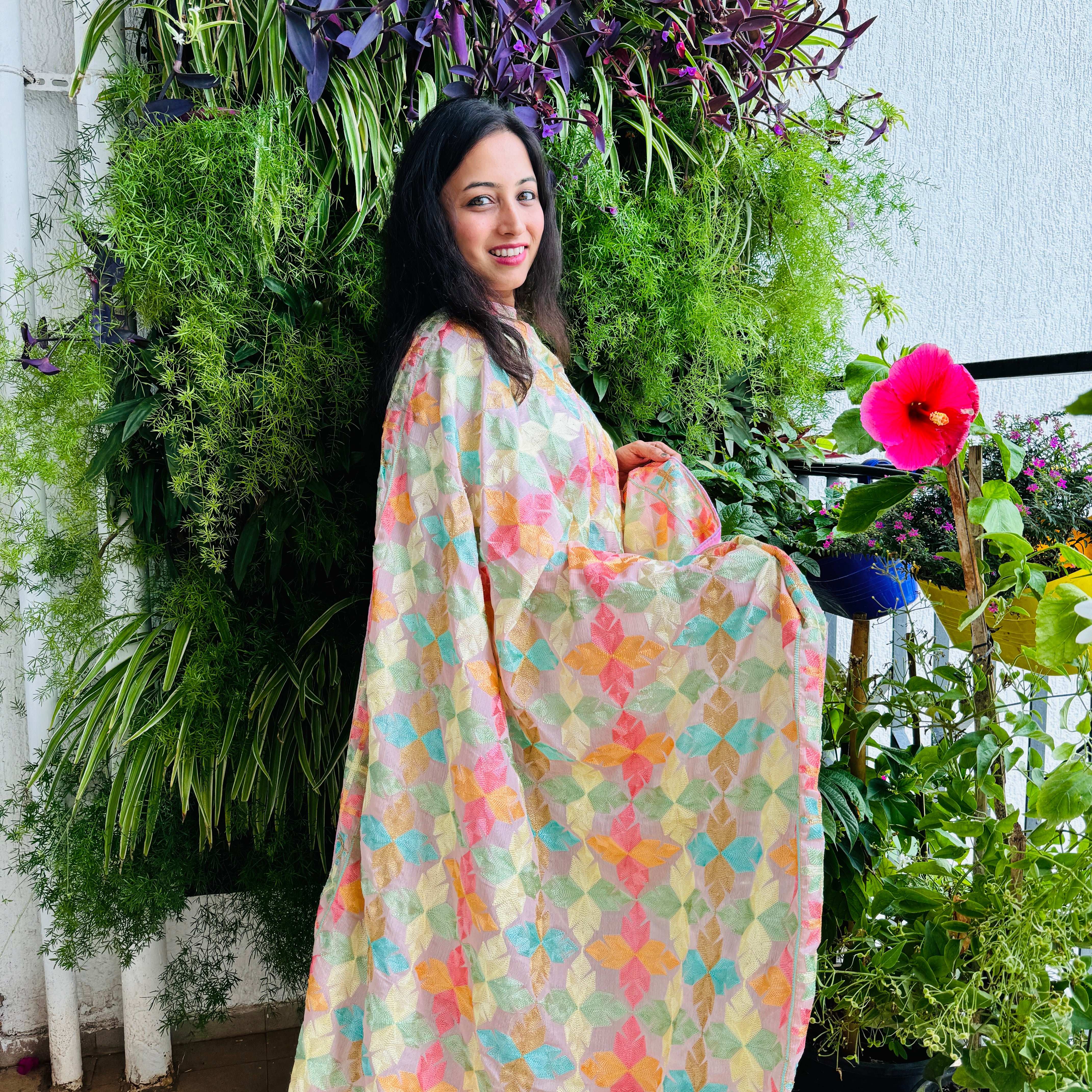 Description: This Phulkari dupatta in chinnon with multicolored thread work has all over floral design perfect for an ethnic look.