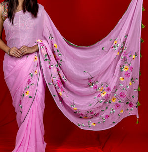 Georgette Hand-Painted Saree - Robin - Light Pink