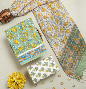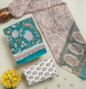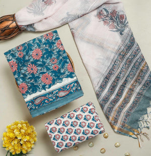 This Kota Doriya suit materials is the perfect wear for every occasion. The fabric is hand-printed with various motifs using natural dyes.