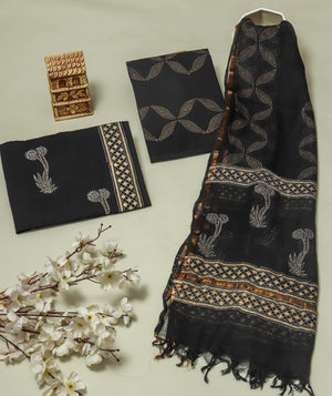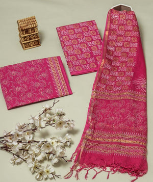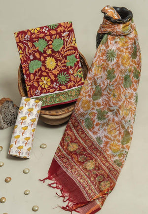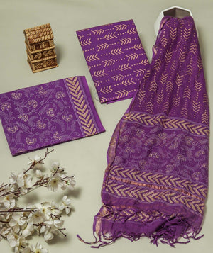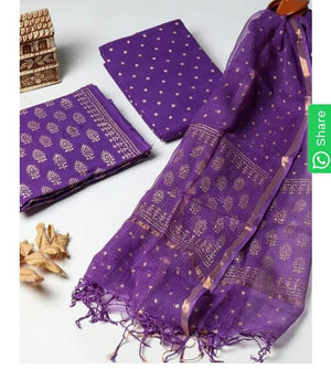 This Kota Doriya suit materials is the perfect wear for every occasion. The fabric is hand-printed with various motifs using natural dyes.