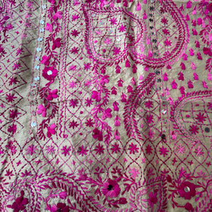 This enchanting Chanderi Hand-Embroidered Dupatta is ideal for small celebration or traditional occasion. It has a beige base with floral motifs hand-embroidered in pink coloured thread on the entire fabric. Pair it with a lehenga or kurta. Add oodles of elegance with this dupatta.
