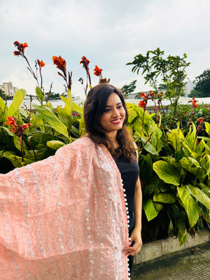 Hand-Embroidered Chanderi Dupatta with Pompom - Peach