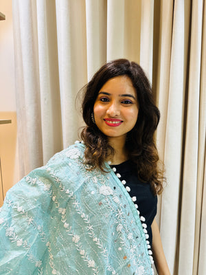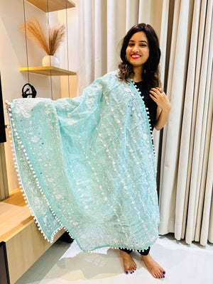 Hand-Embroidered Chanderi Dupatta with Pompom - Sea Blue