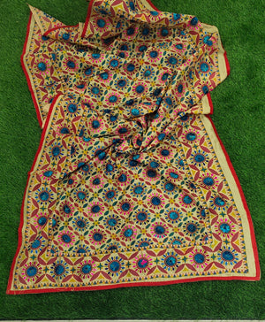 Hand Embroidered Madhubani Chanderi Dupatta- Red Circles Multicolour