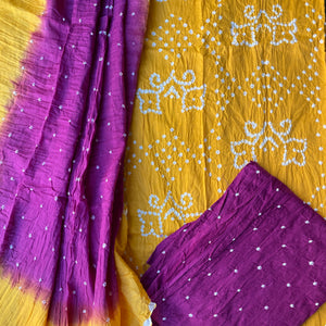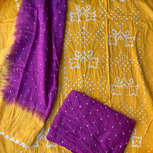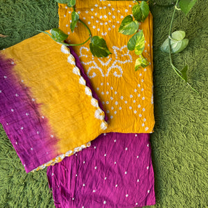 Hand Tied Bandhani Pure Soft Cotton Unstitched Salwar Suit Fabric - Yellow and Magenta
