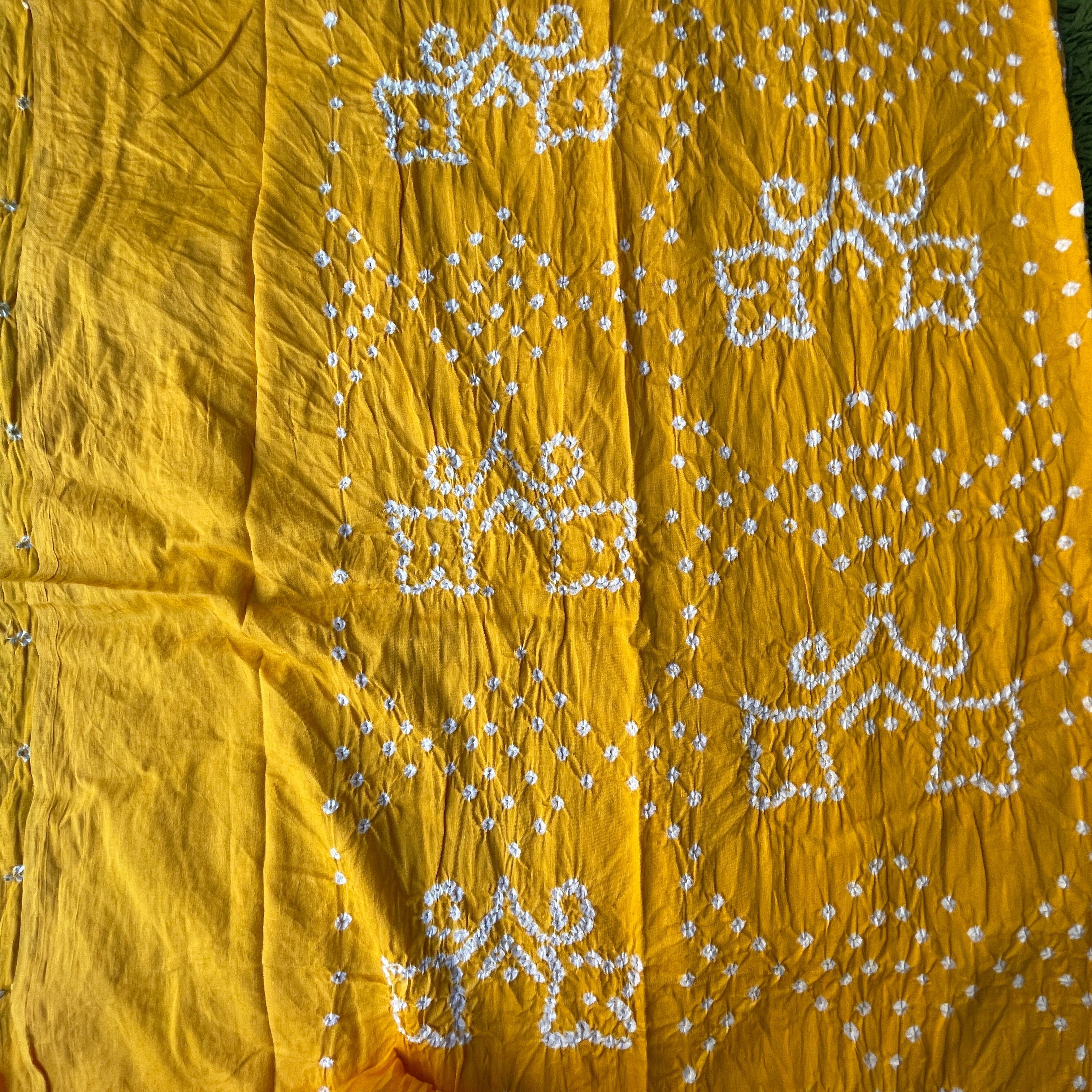 This hand made Bandhani salwar suit fabric is elegant and comfortable. It has beautiful hand tied bandana design on the entire fabric. The dupatta is Mul Cotton with small border. This suit fabric is ideal for all casual events, work and small occasions.