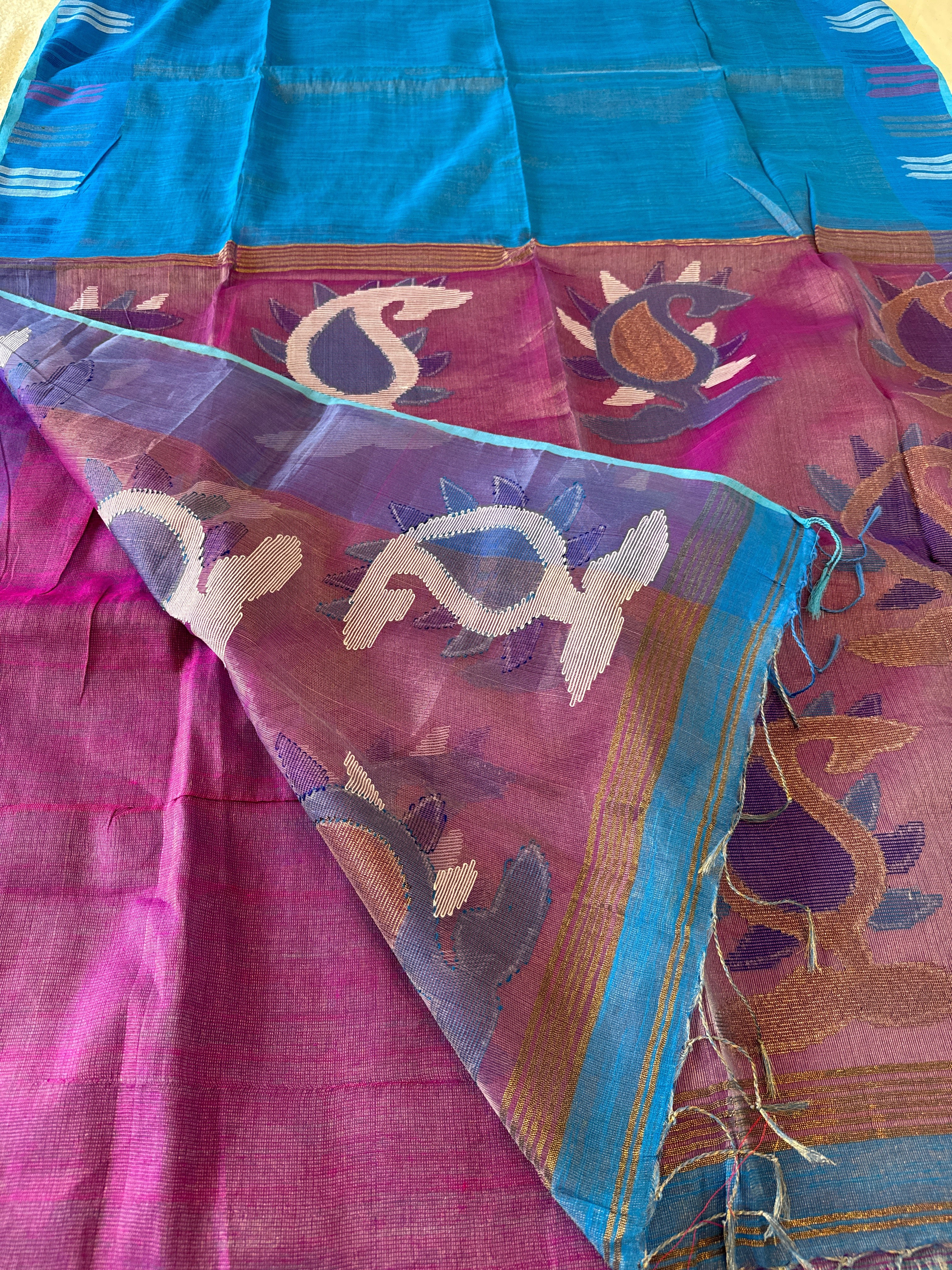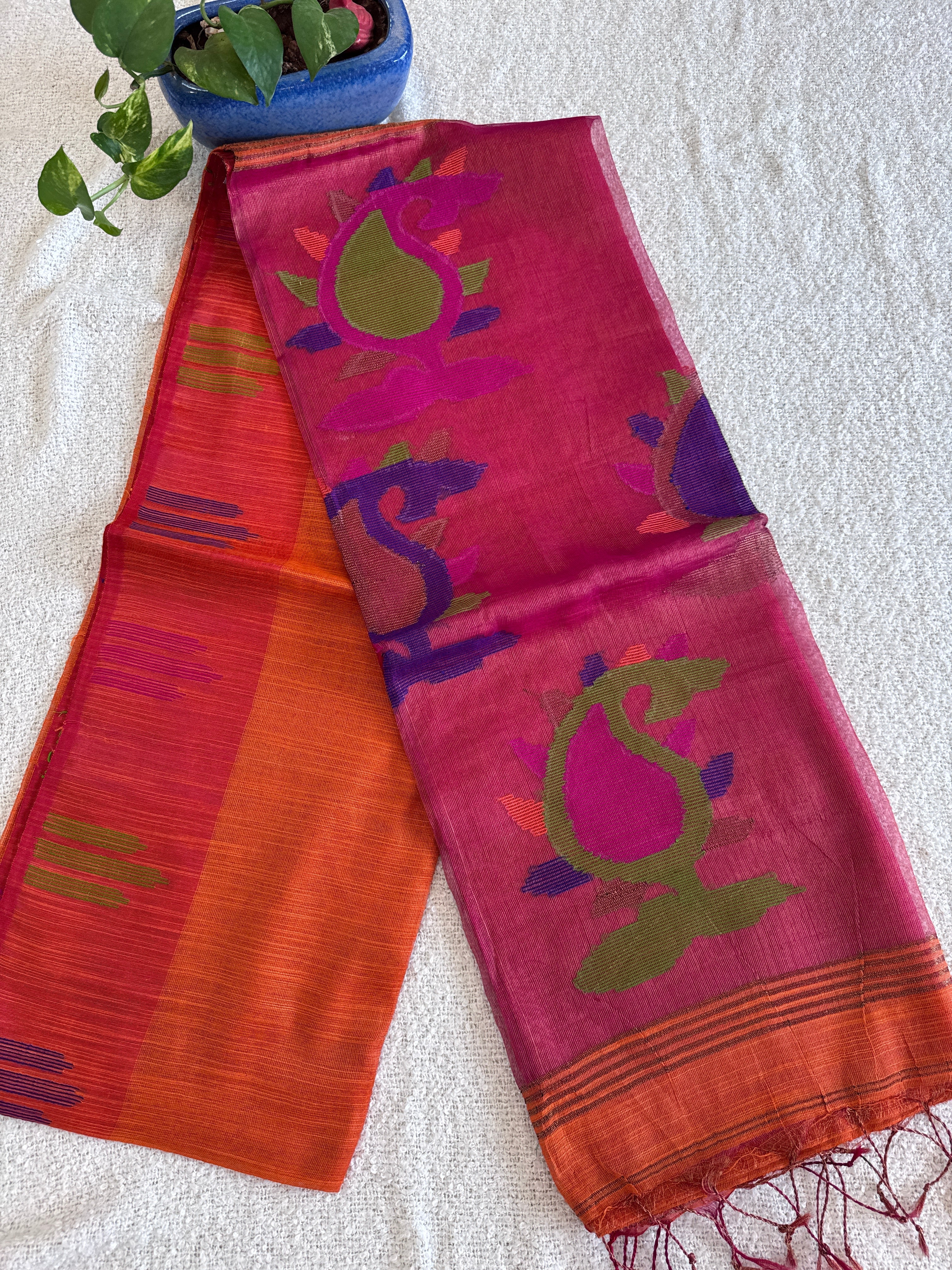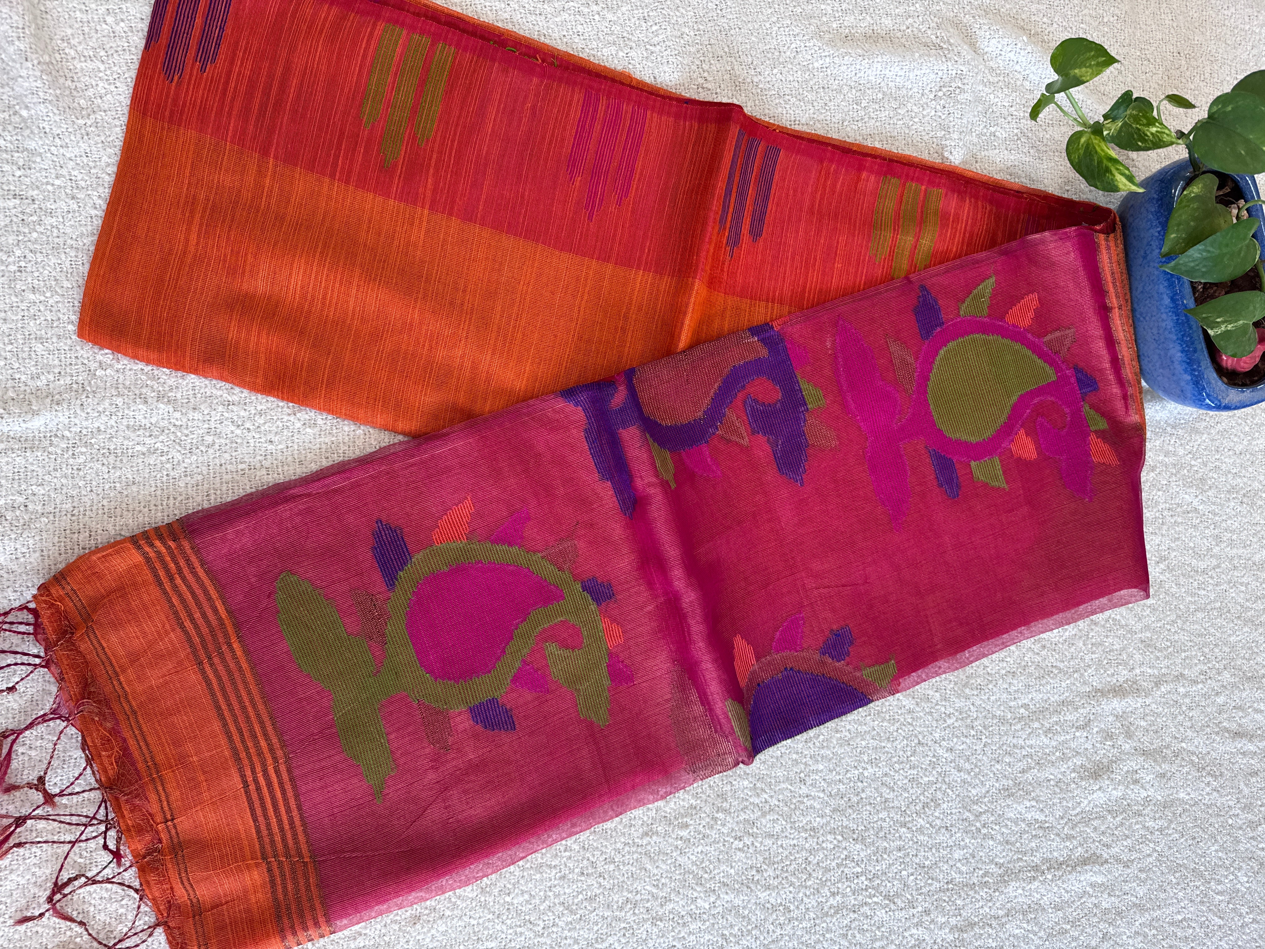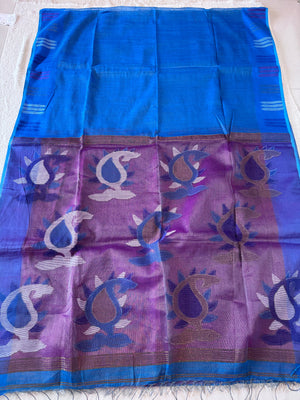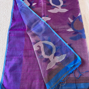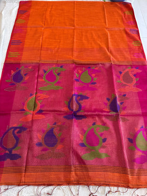 Hand Woven and Handloom Pure Muslin Motka Silk Jamdani - Orange, Blue