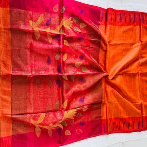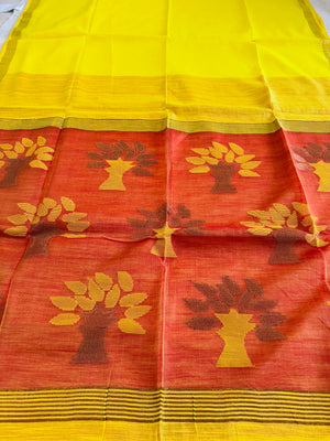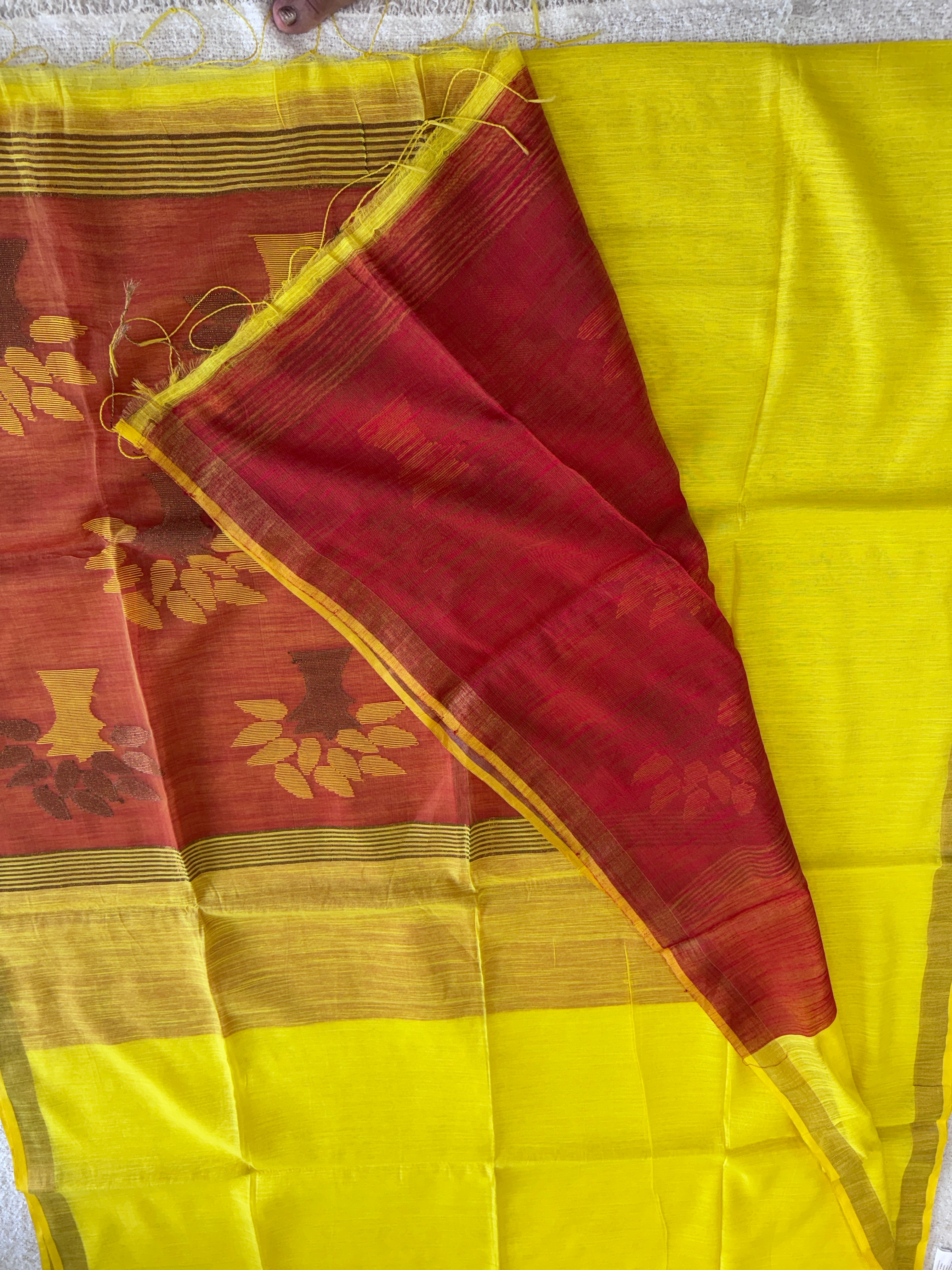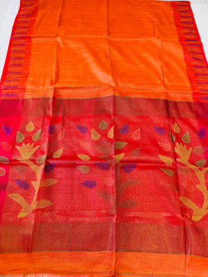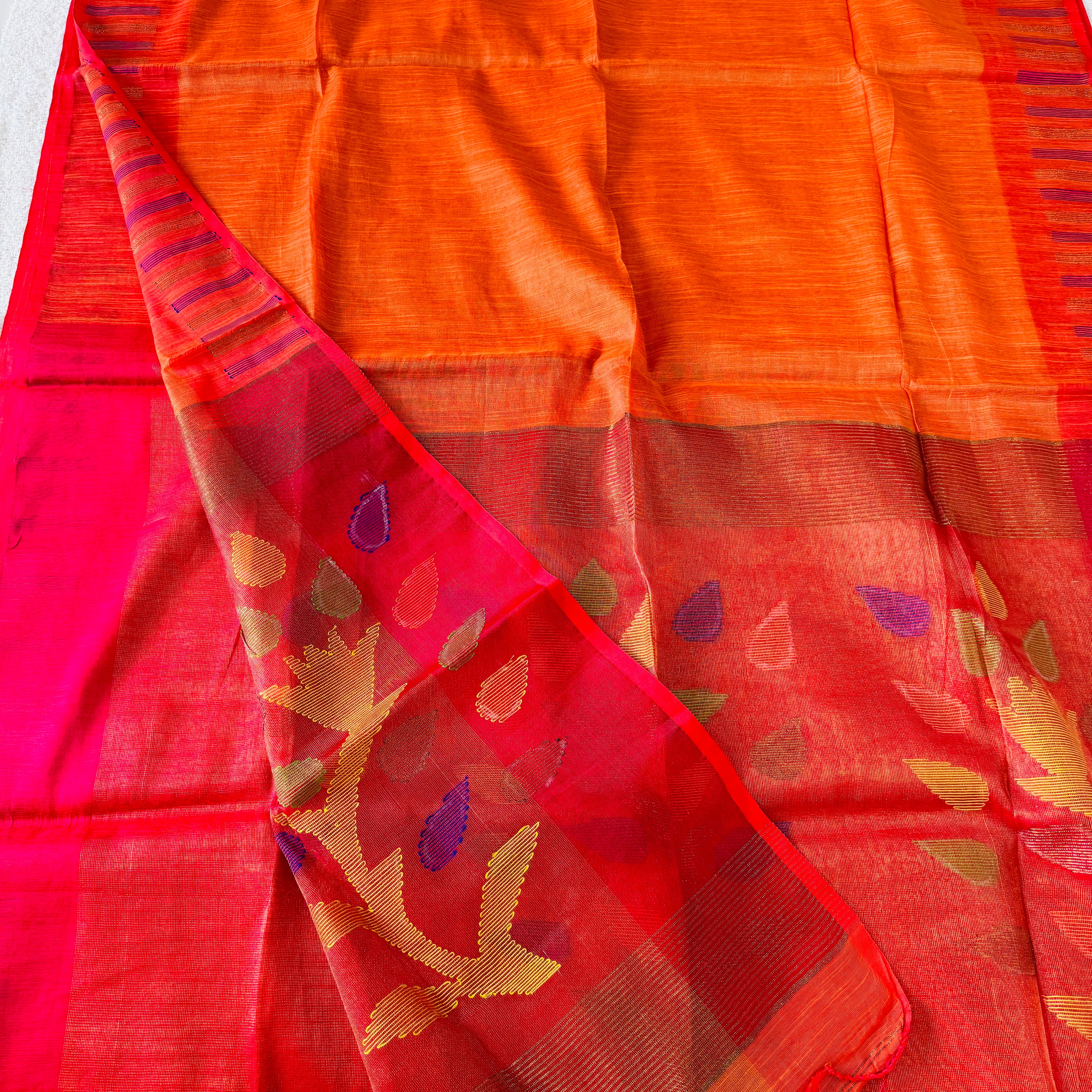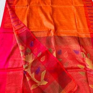 Hand Woven and Handloom Pure Muslin Motka Silk Jamdani - Orange, Yellow