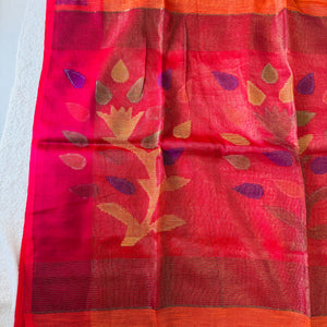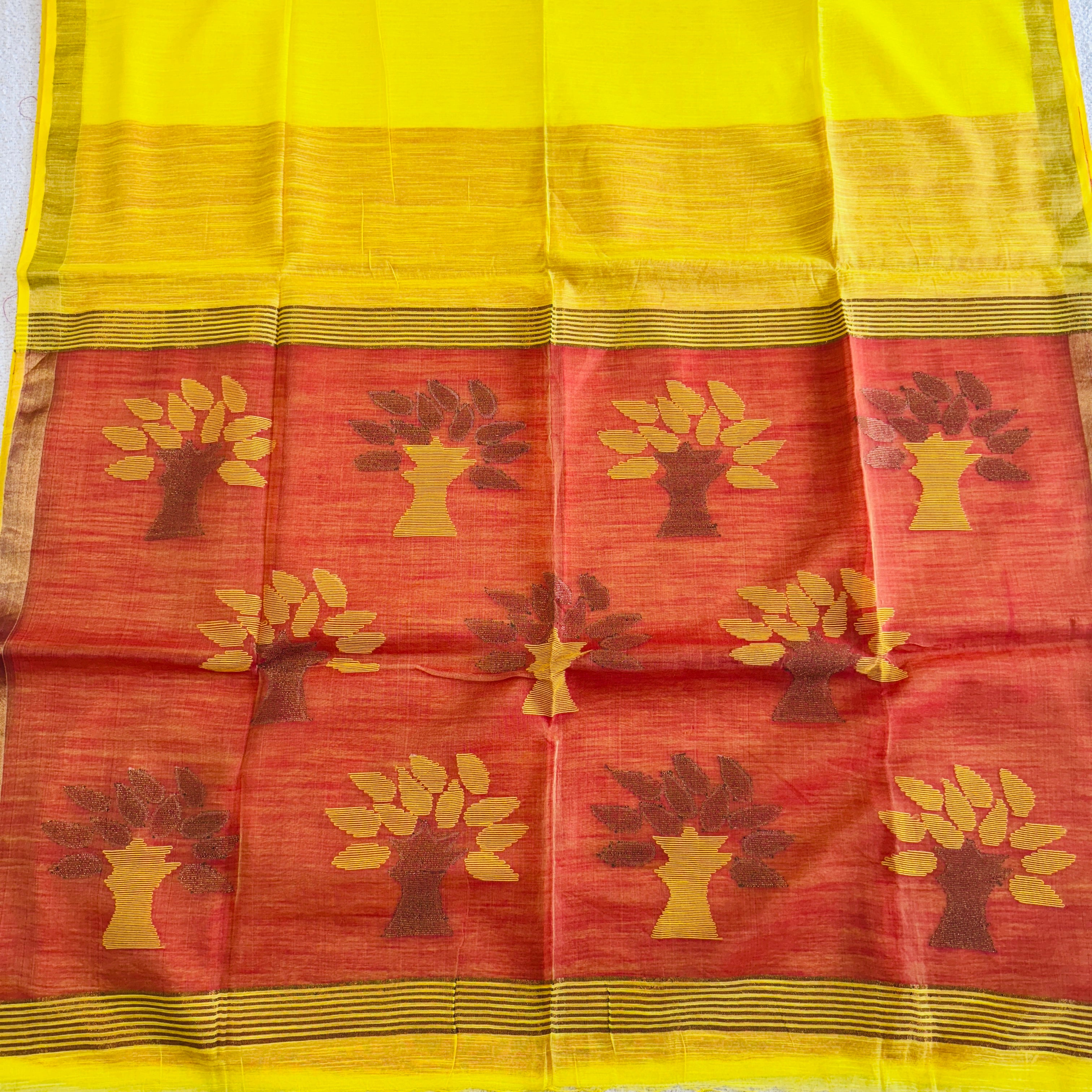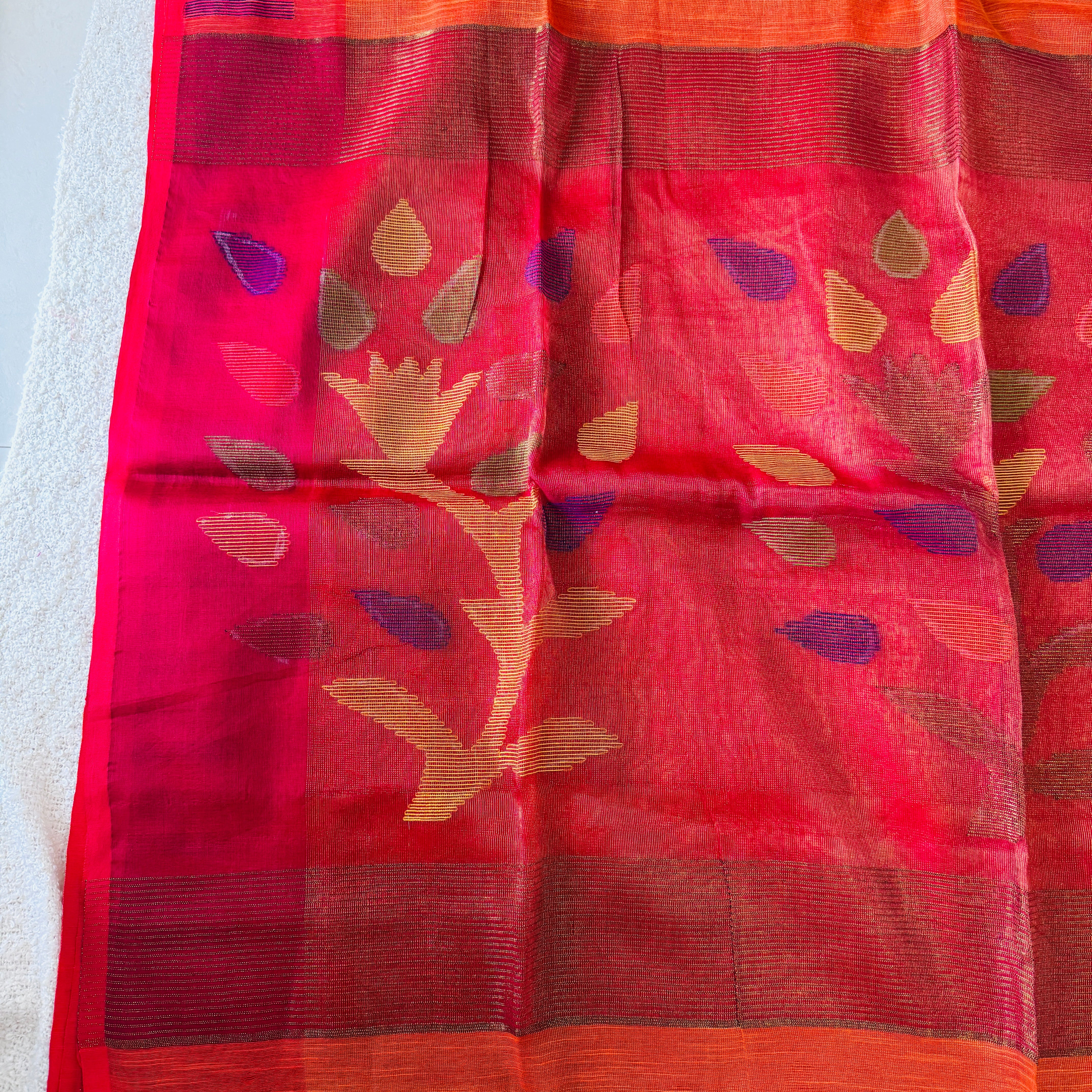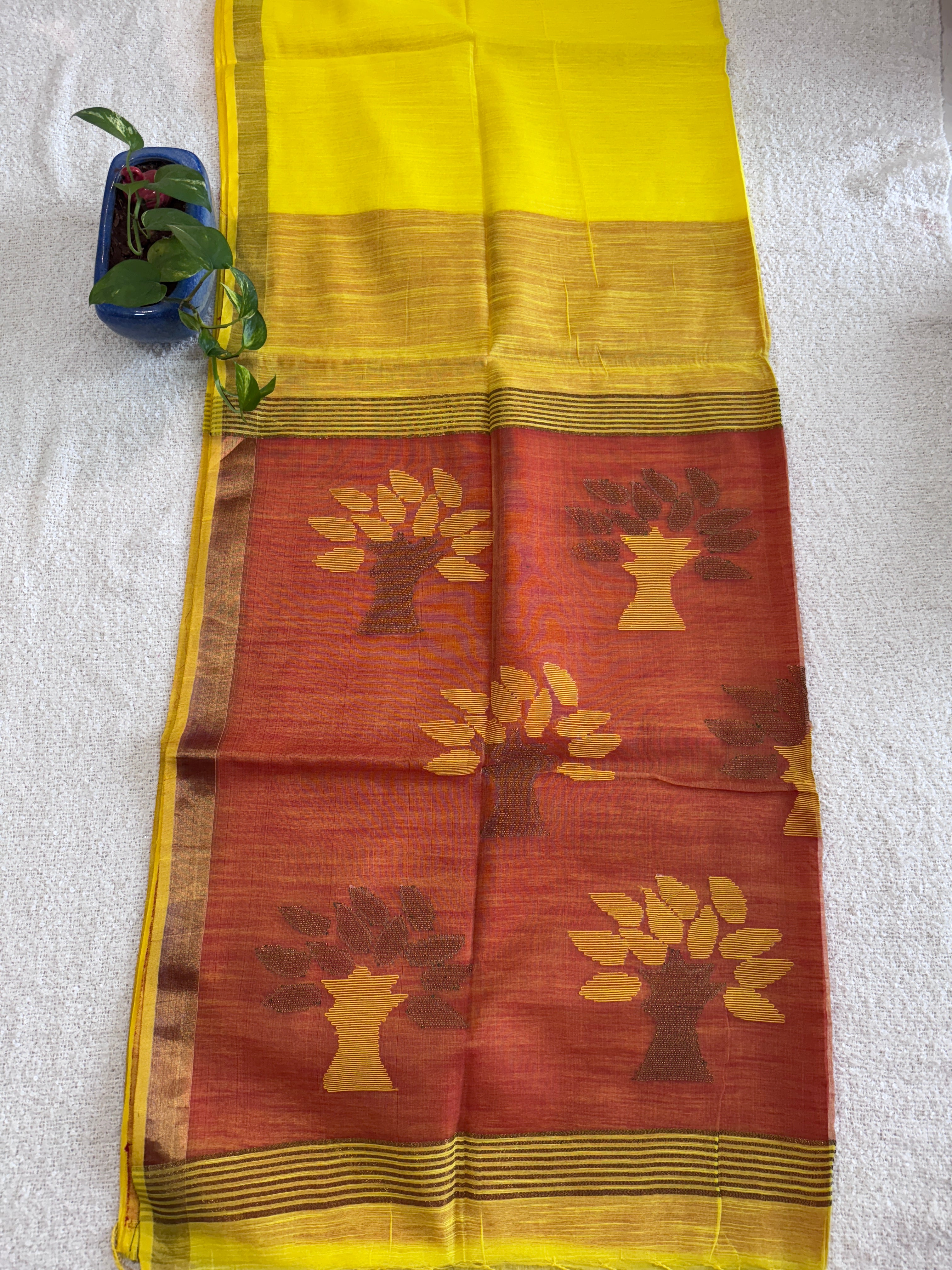 Hand Woven and Handloom Pure Muslin Motka Silk Jamdani - Orange, Yellow