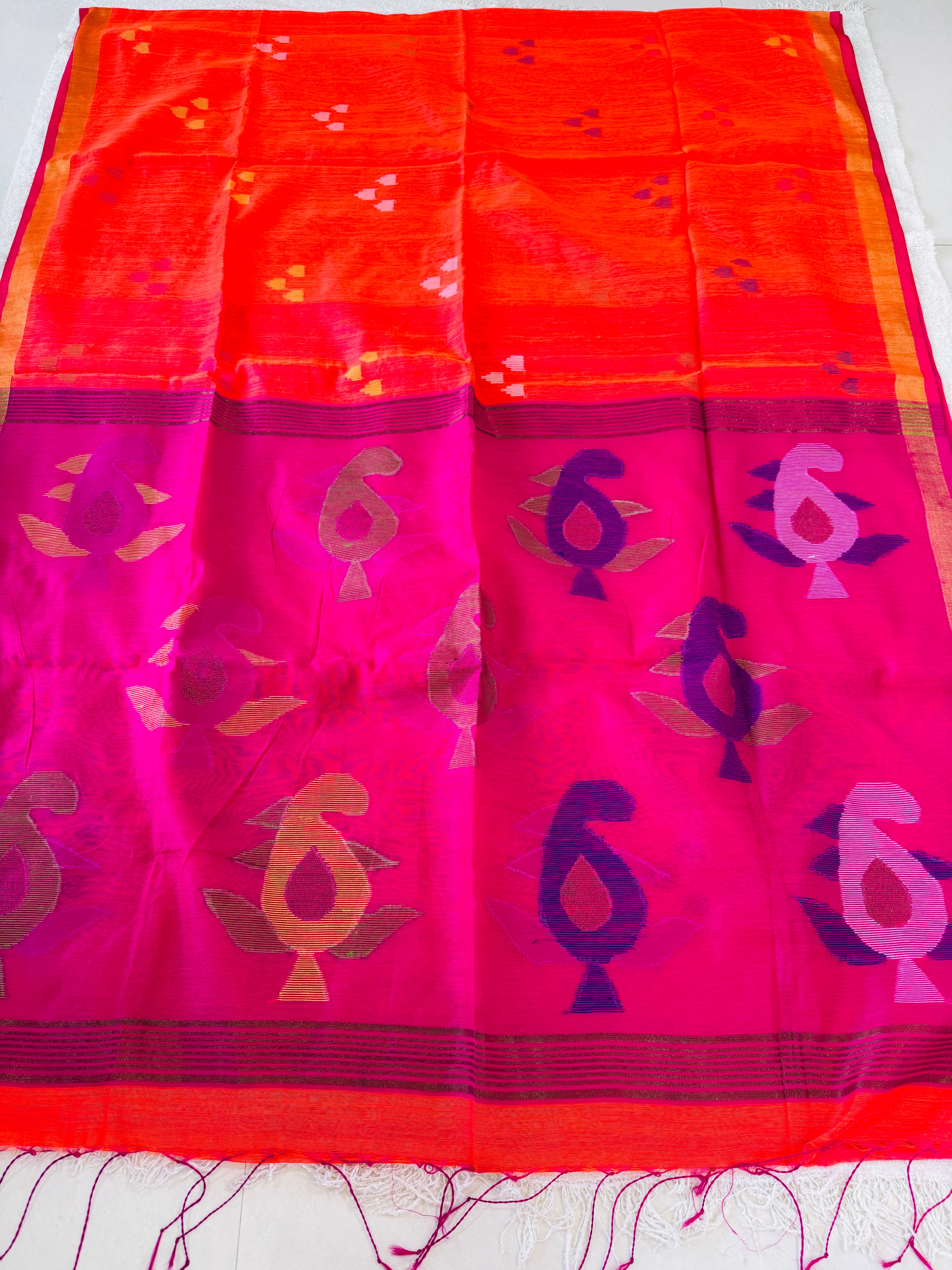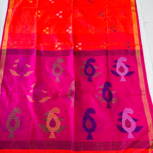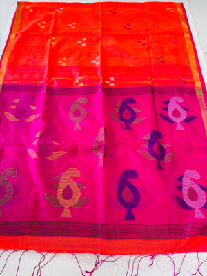 Hand Woven and Handloom Pure Muslin Motka Silk Jamdani - Orange and Pink