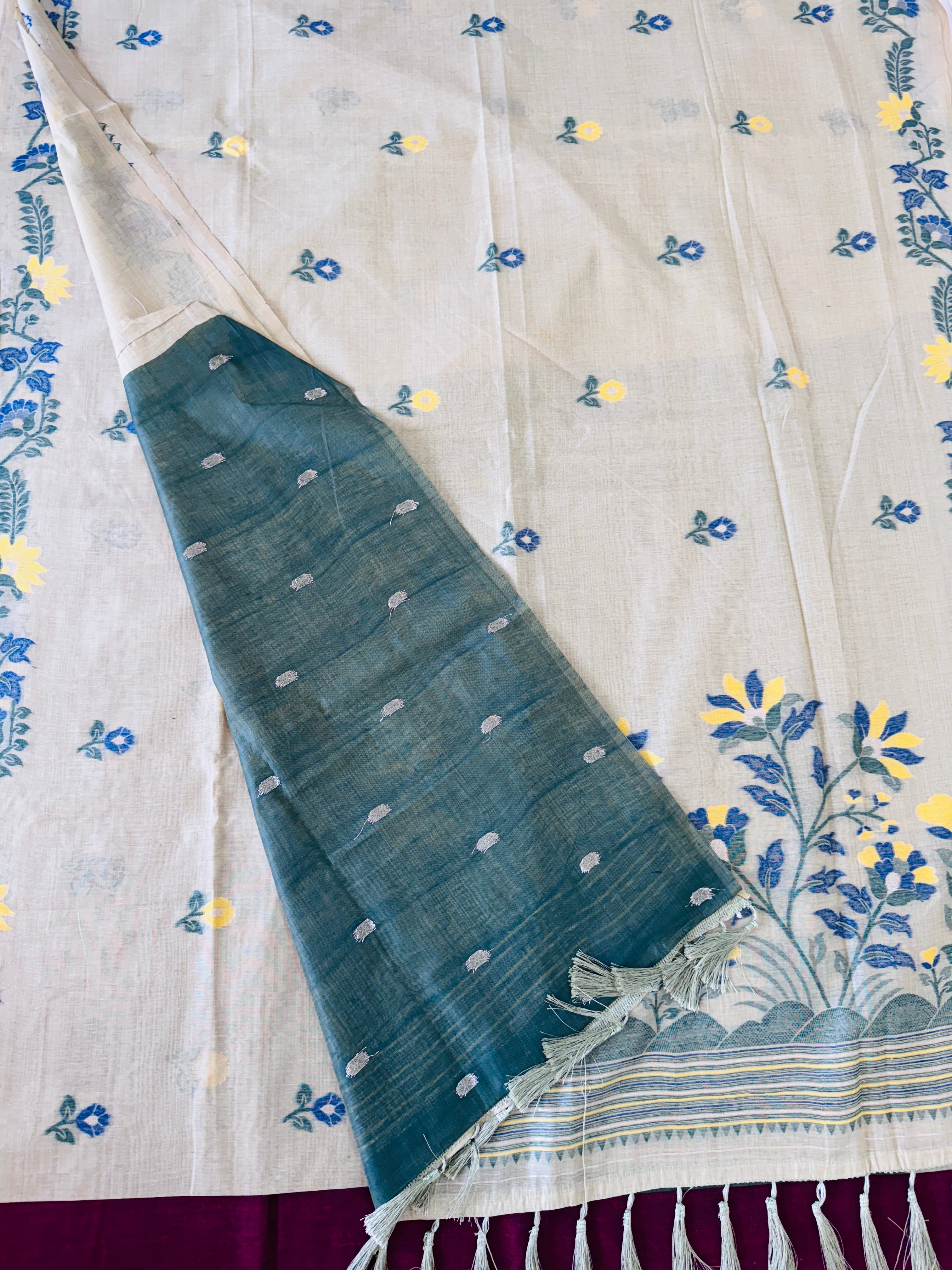 Add a touch of ethnic to your attire by wearing this beautiful jamdani saree. Exotic Munga Silk with Paithani design is hand woven by our artisans from West Bengal, the sari is a woven traditional craft. The saree has a graceful floral pattern jamdani butter design which makes the apparel stand out beautifully. A timeless crafted piece to give you a chic and classy style statement with a dark olive green blouse piece. Add a piece of statement jewellery to complete the look.