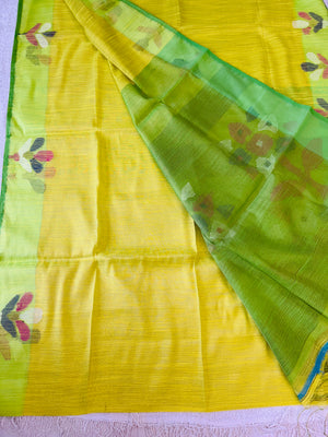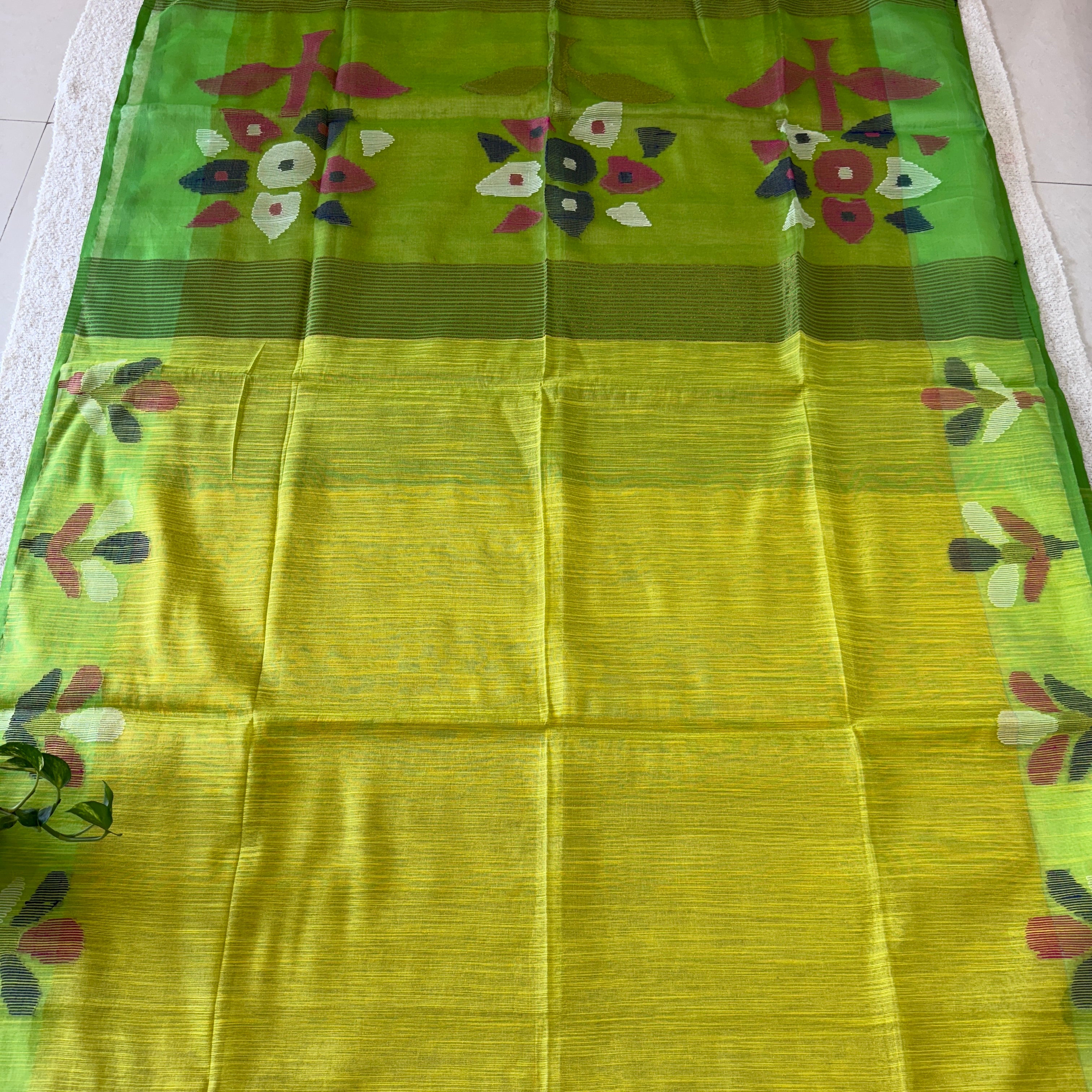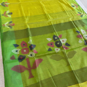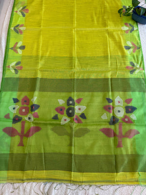Hand Woven and Handloom Pure Muslin Soft Silk Jamdani - Parrot Green and Olive Green