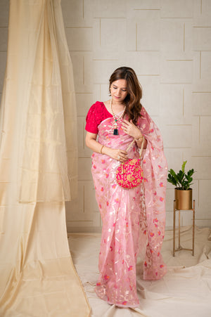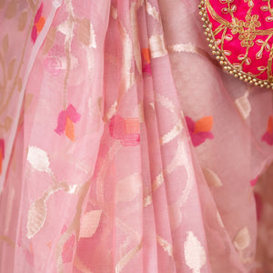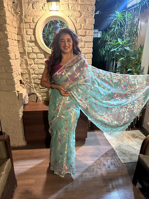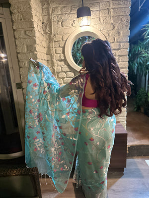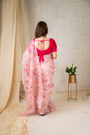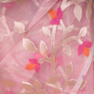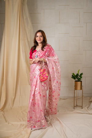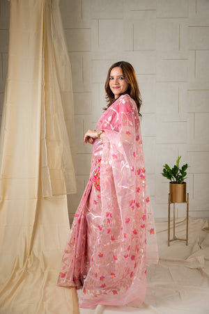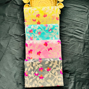 Muslin Jamdani Woven Saree - Pink, Blue, Yellow, Black