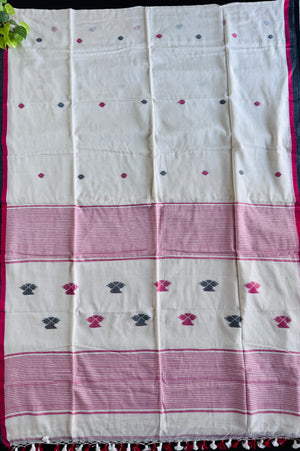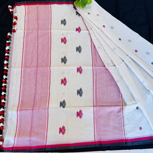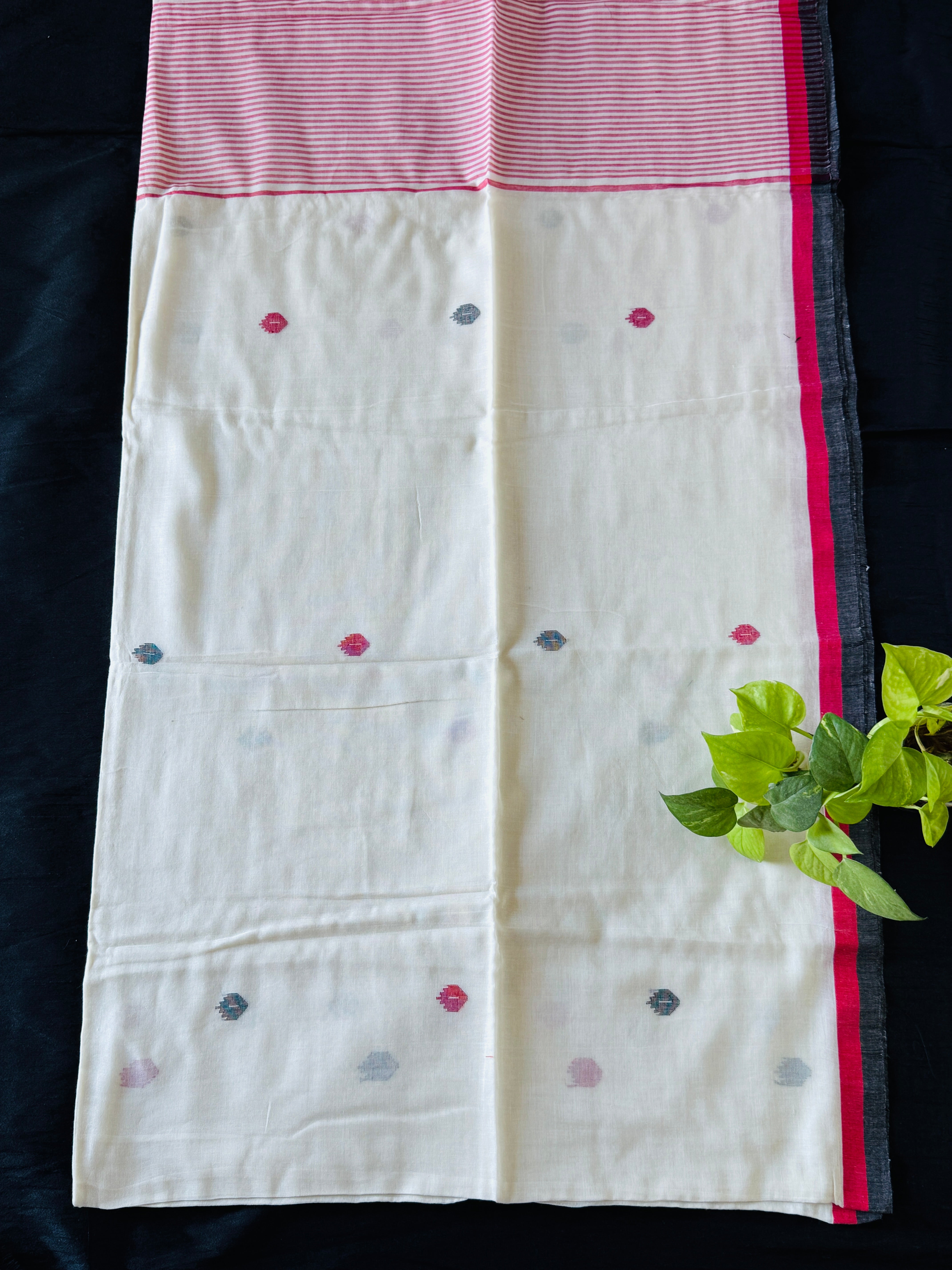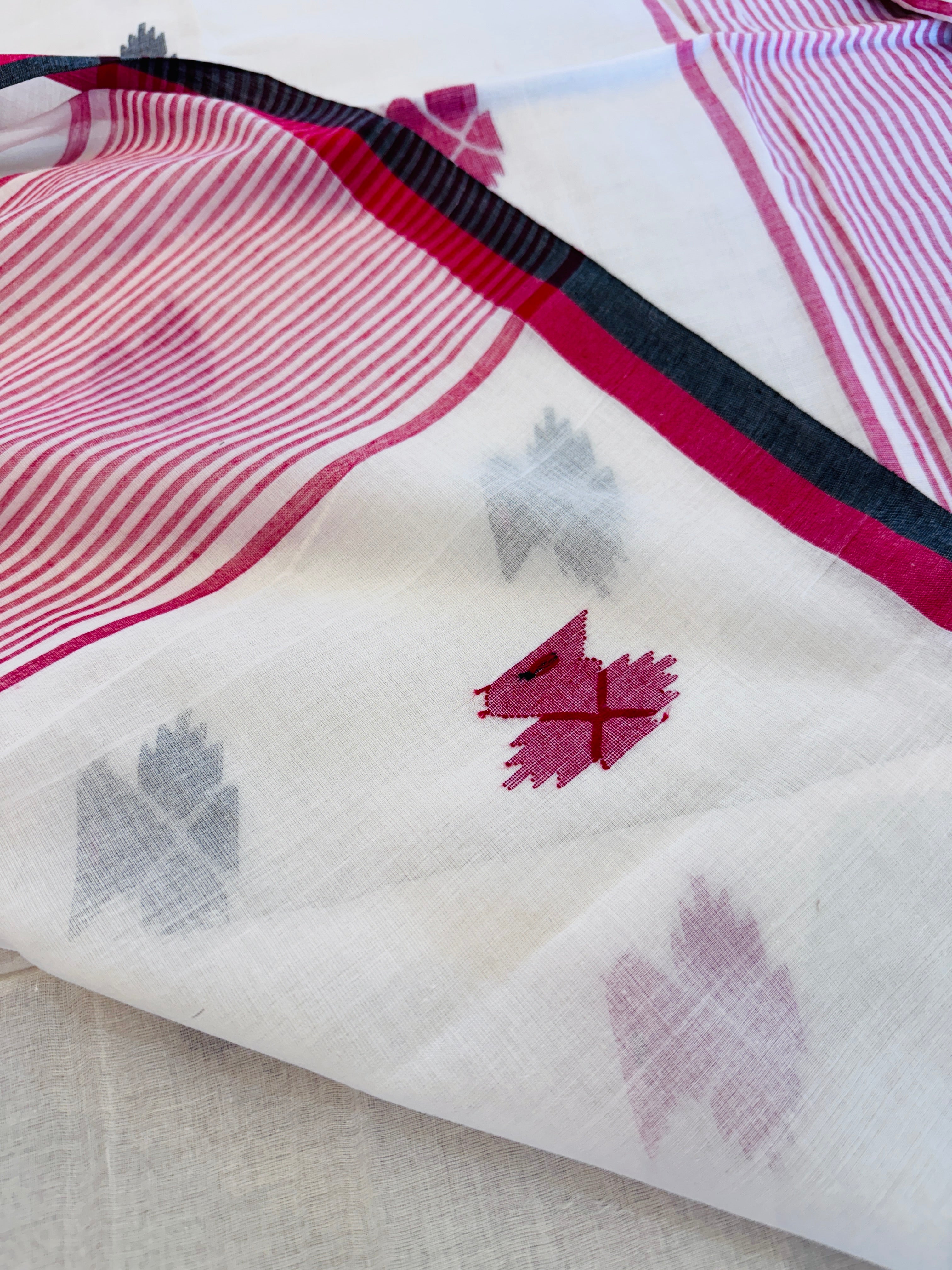 This eye-catching soft handloom jamdani saree is beautifully woven by the rural artisans. It is very comfortable, lightweight and elegant. The colors are so pleasing and attractive, that sporting it for a traditional event or formal function will be perfect.