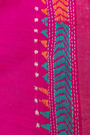 This Hand-embroidered Jamdani Silk Kantha Saree, is a stellar. It has symmetrical designs on the entire fabric. It is bright, light and comfortable, making it ideal for a celebration and traditional puja. Pair with traditional earrings.