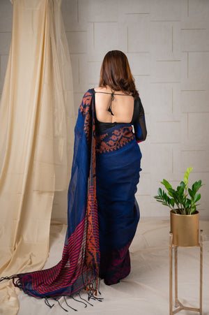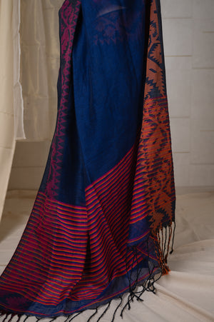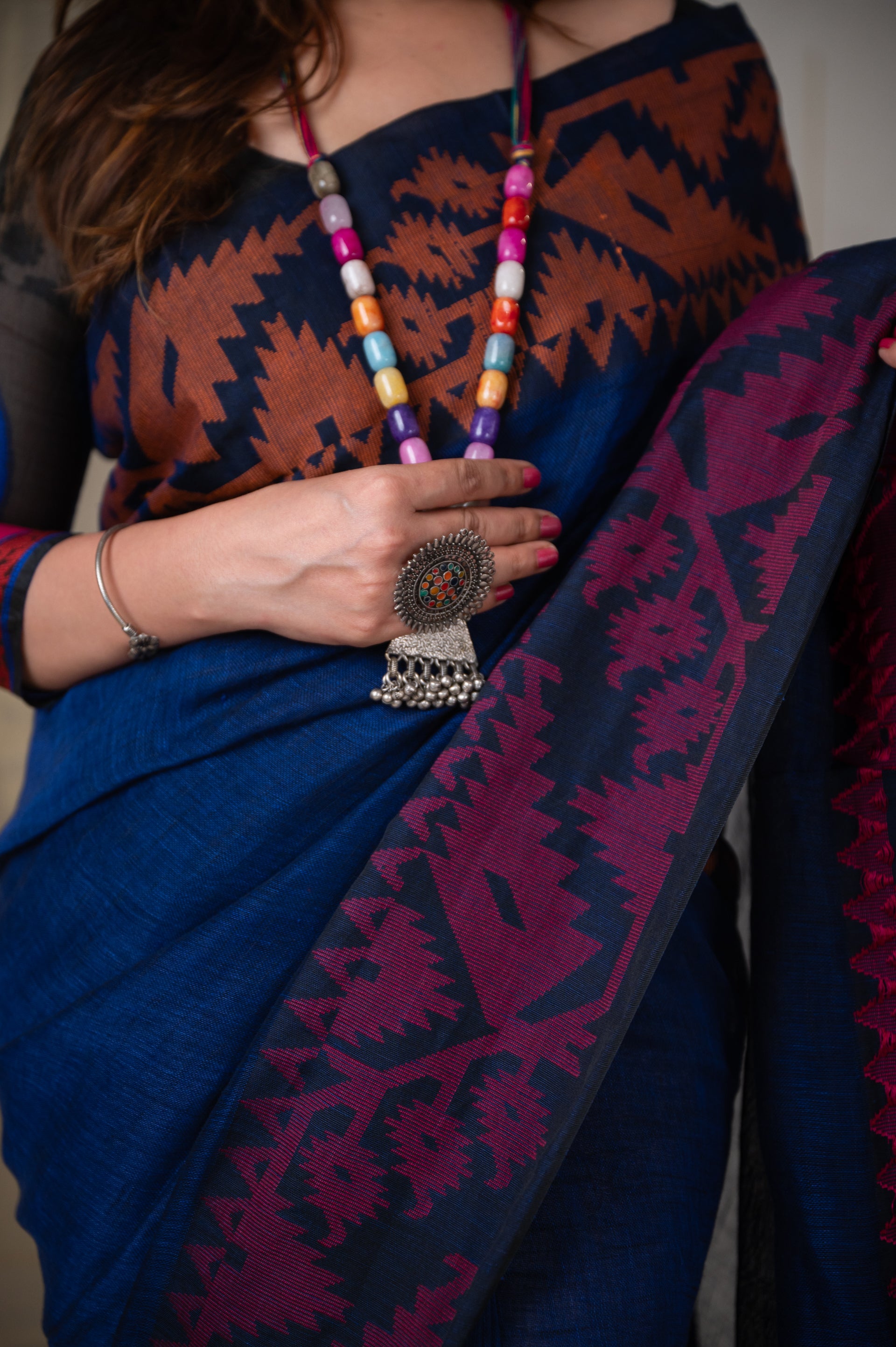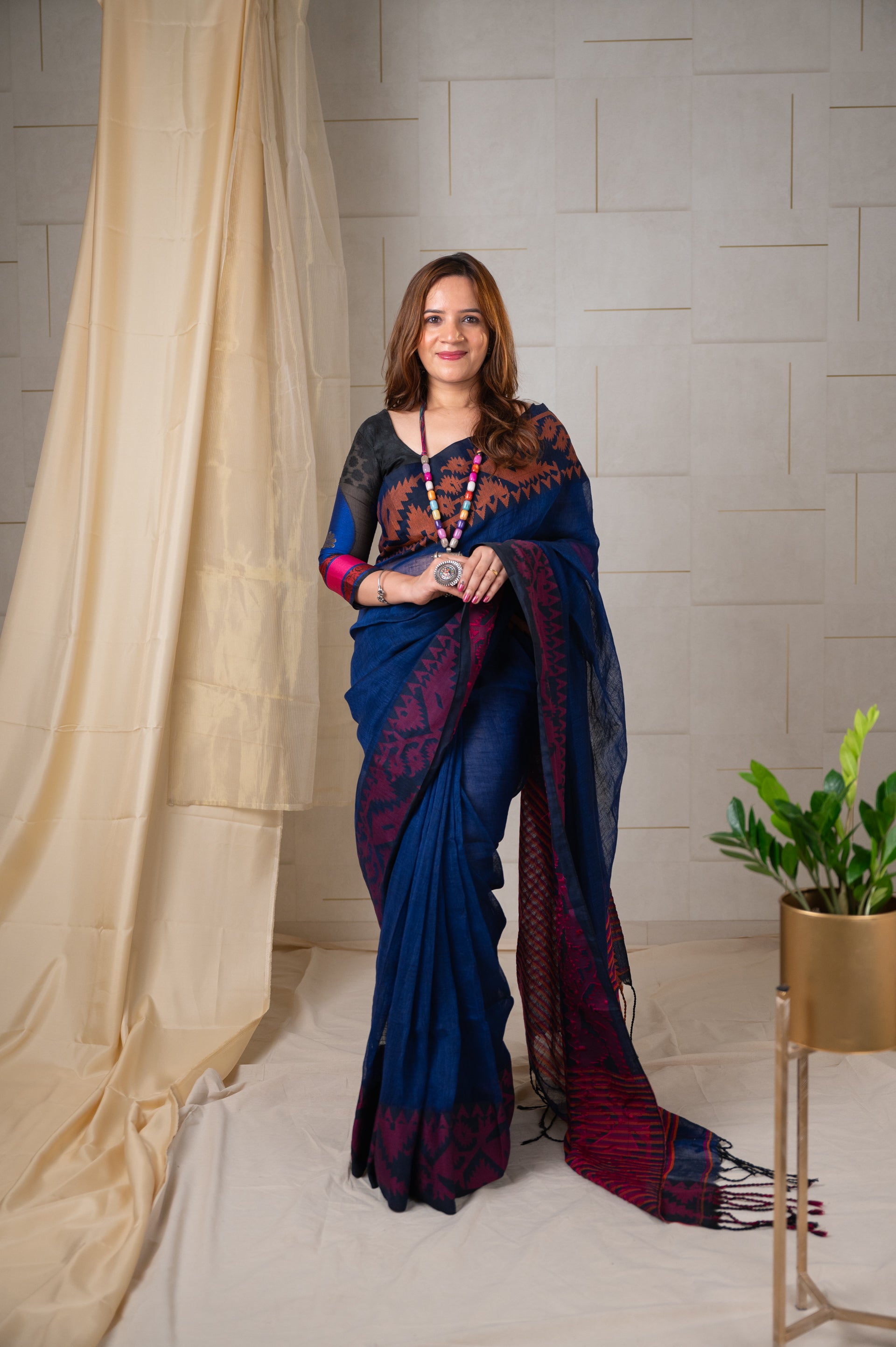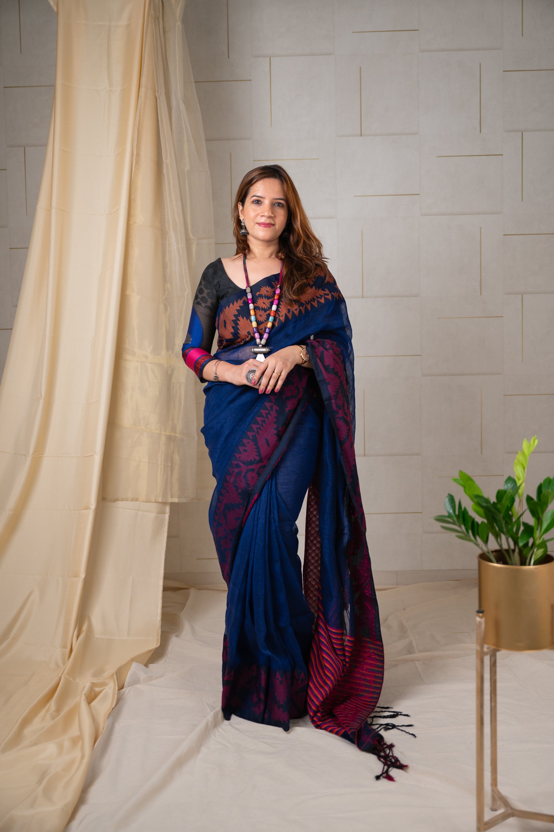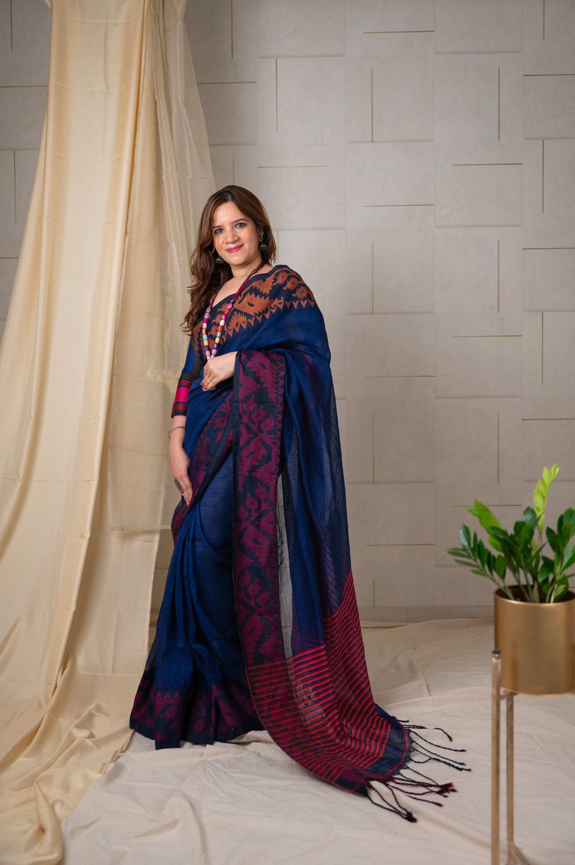 Elegant Linen by Linen With beautiful border is ideal for traditional events and celebrations. It has a royal blue base with beautiful border.