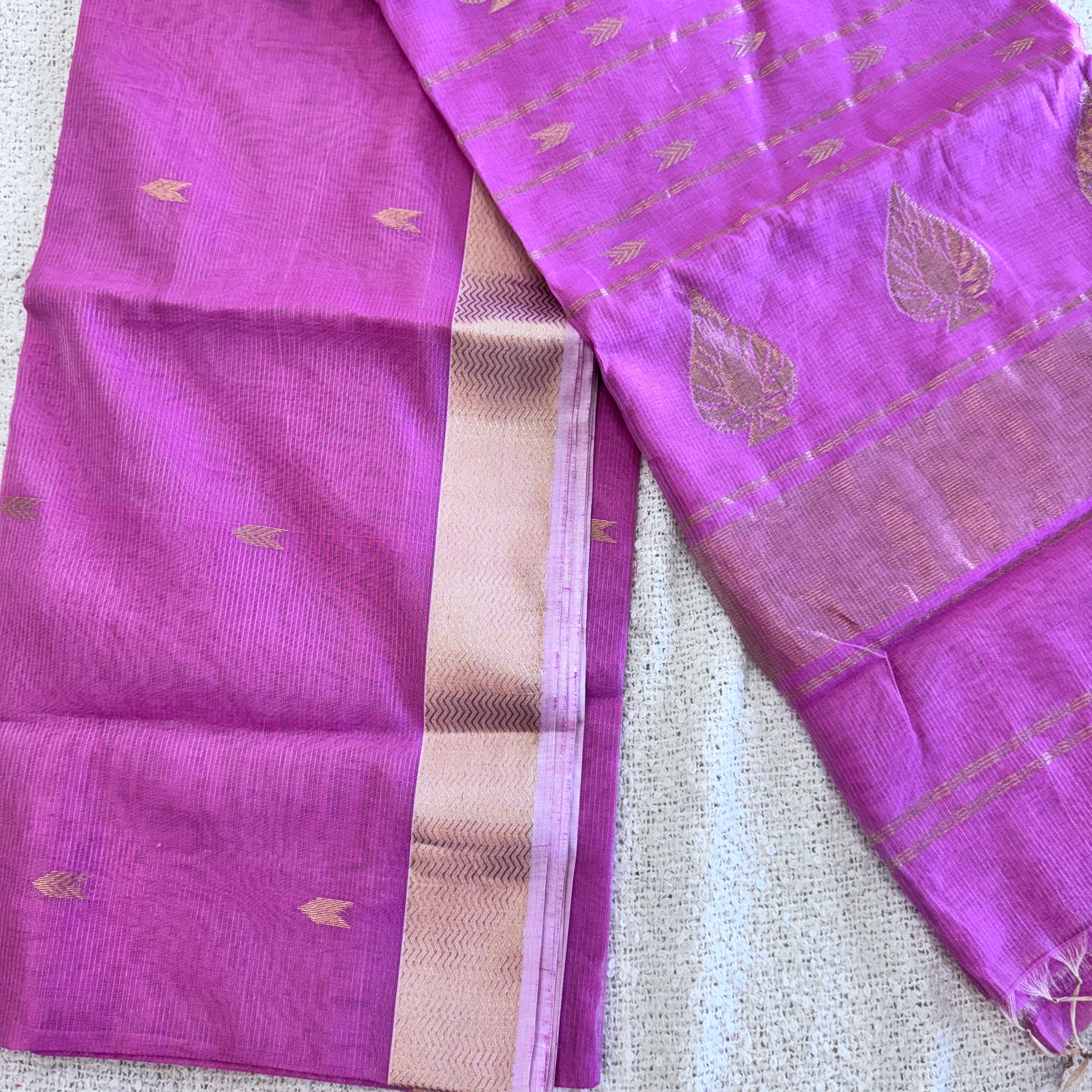 Crafted with meticulous precision and adorned with delicate golden zari borders and stripes, this saree is more than just fabric – it's a symbol of royal craftsmanship and timeless grace.