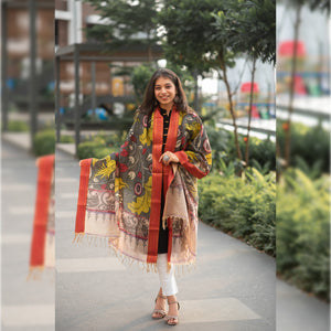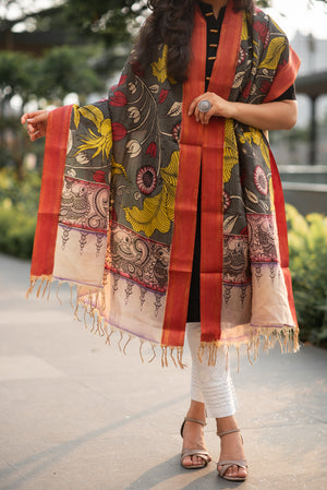 This Pen Kalamkari Hand Painted Chinoor Silk Dupatta is emblazoned with beautiful motifs on the entire fabric. It is perfect for a classy style statement. Match it with your traditional outfit for a captivating look.