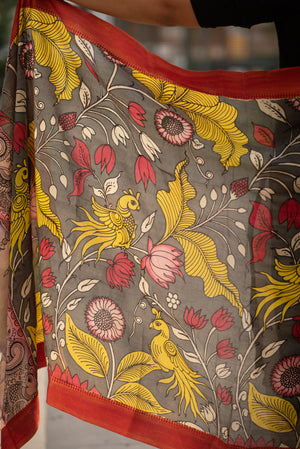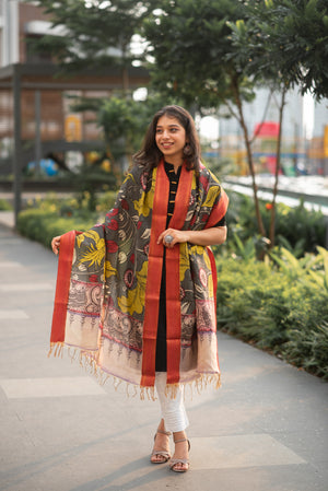 Pen Kalamkari Hand Painted Chinoor Silk Dupatta - Multicolour