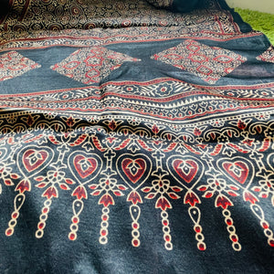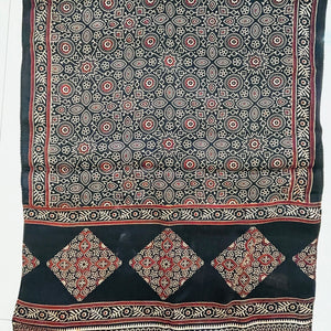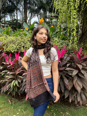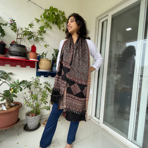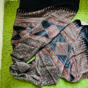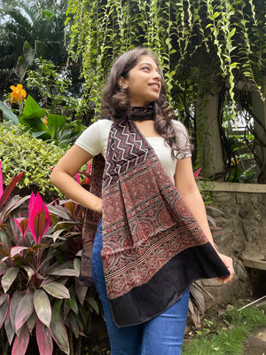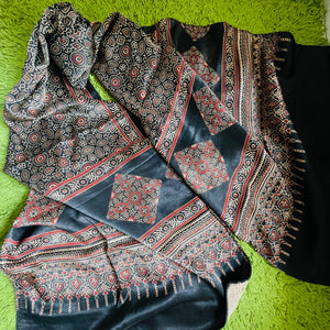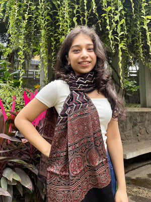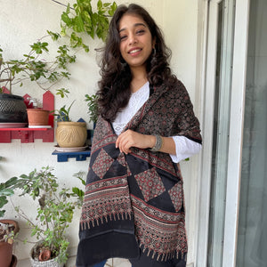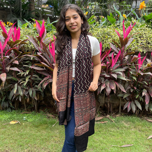 This Mashru Silk Ajrak Print Stole is light weight and classy. It has a black base with motifs block printed on the fabric. This stole is perfect to elevate your outfit.