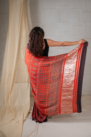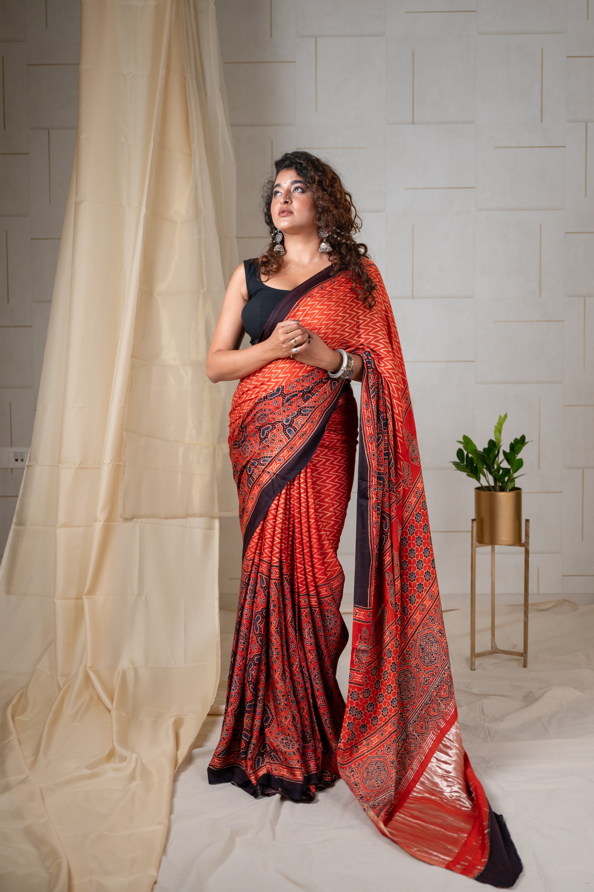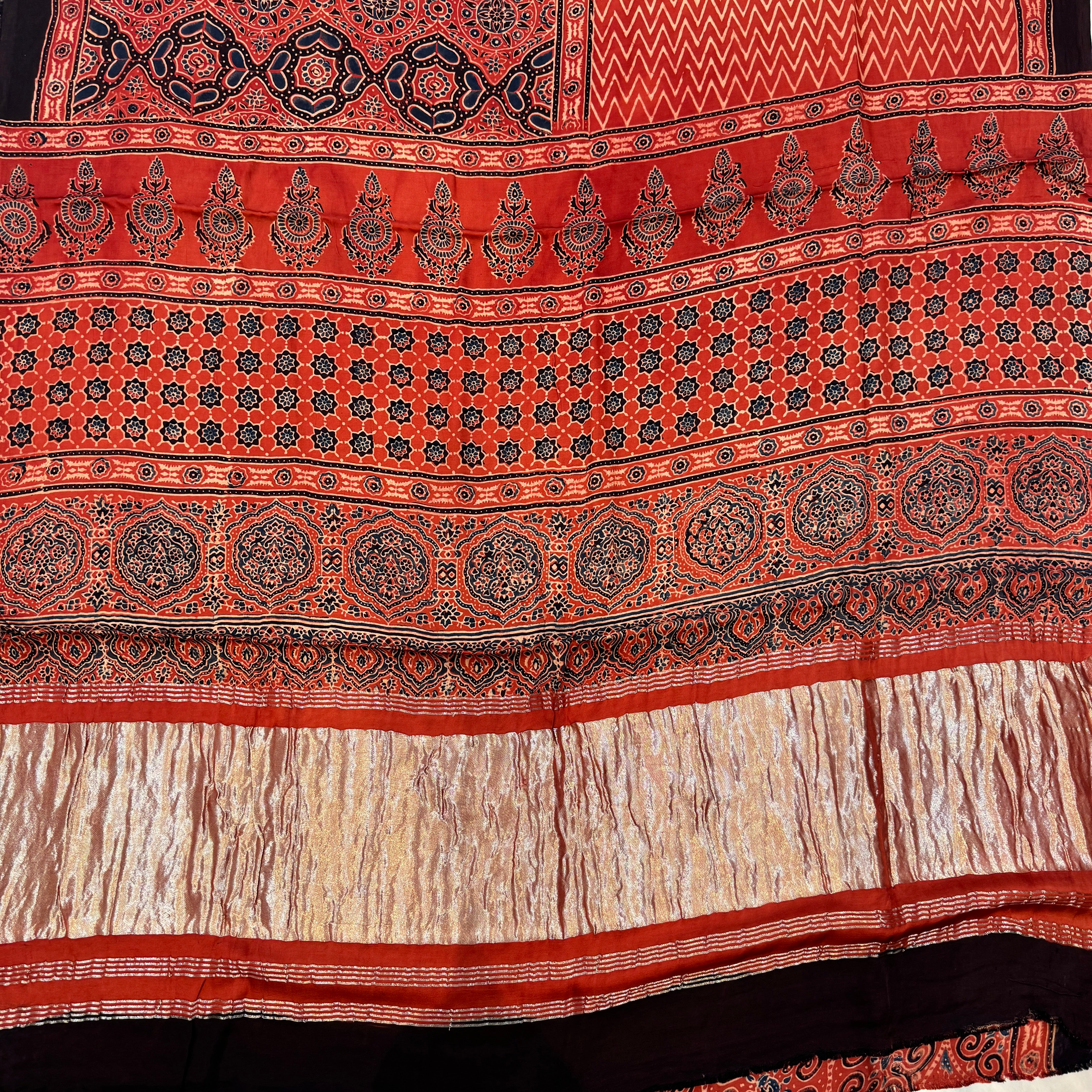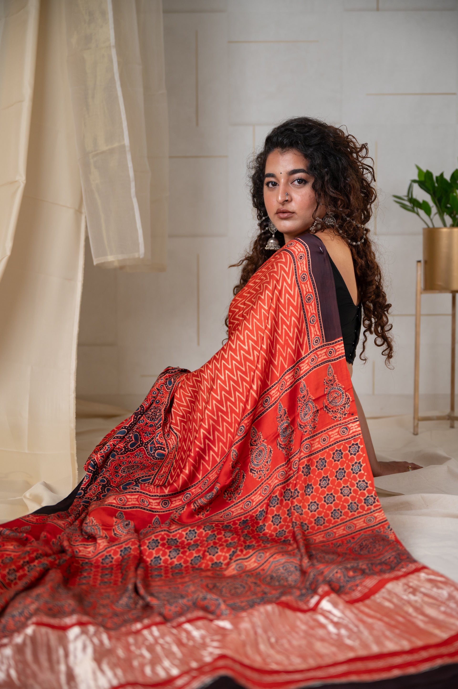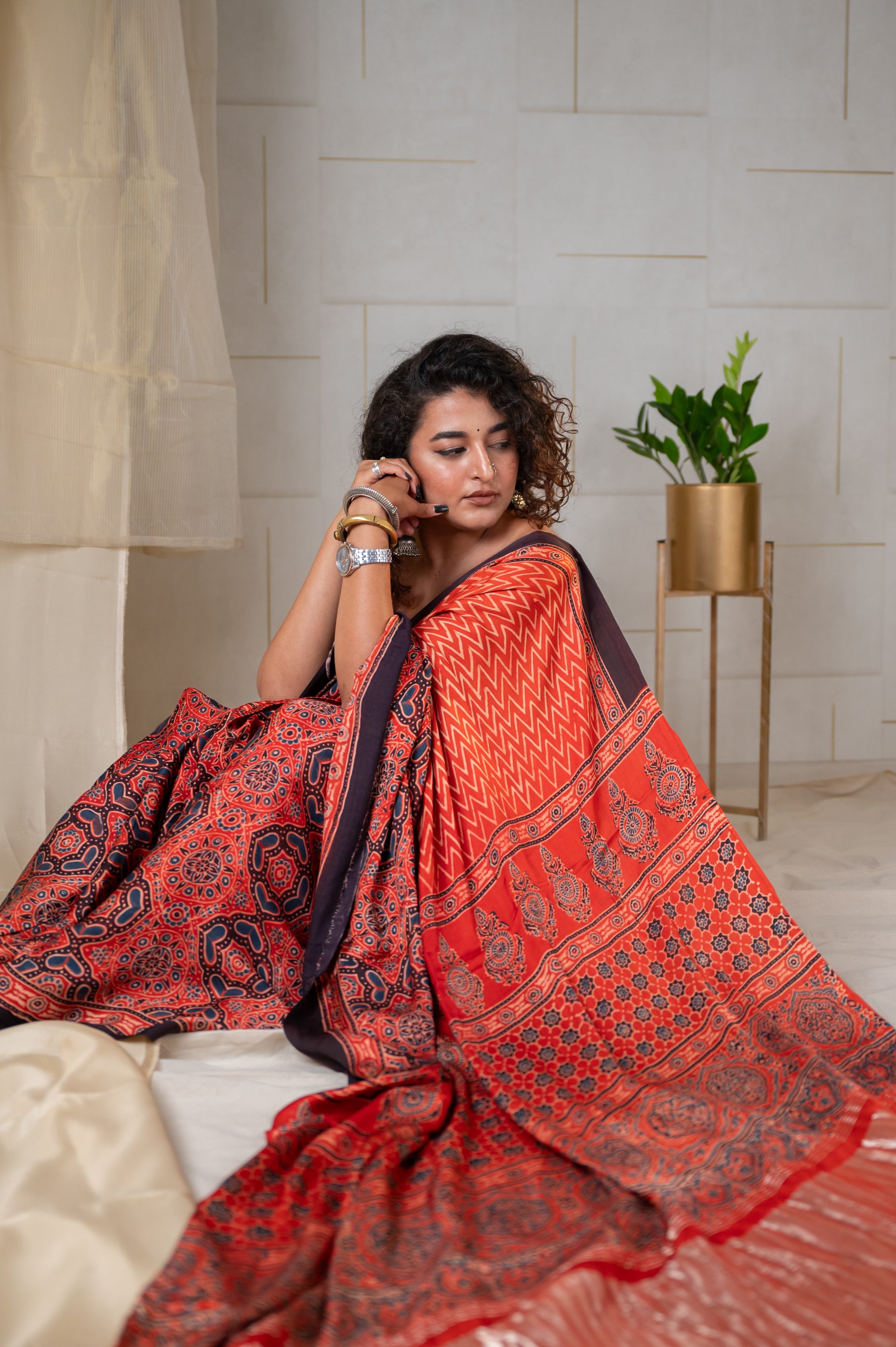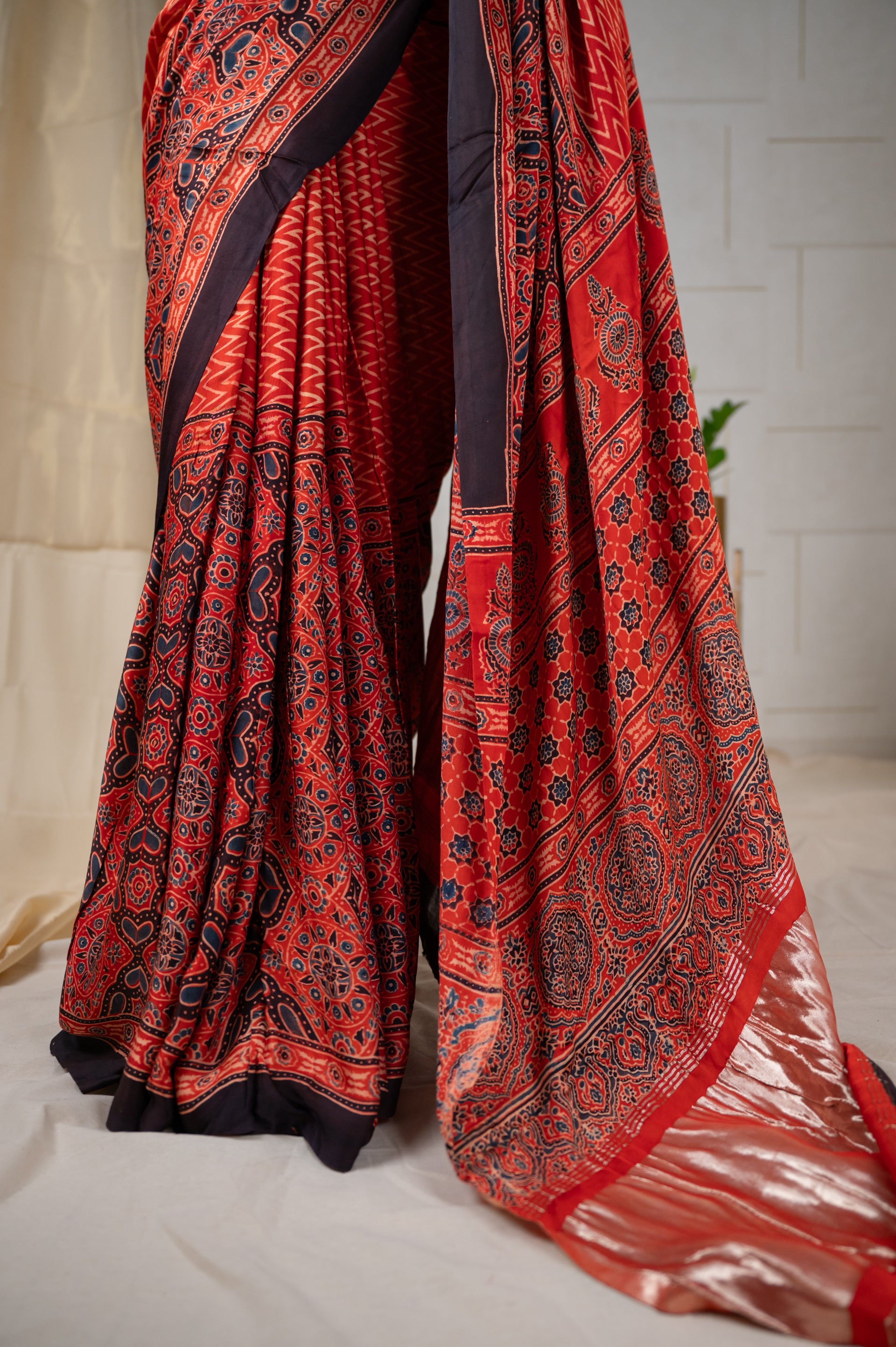 Modal Silk Ajrakh Saree with Zari Pallu - Brick Red