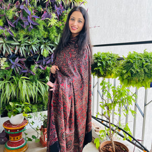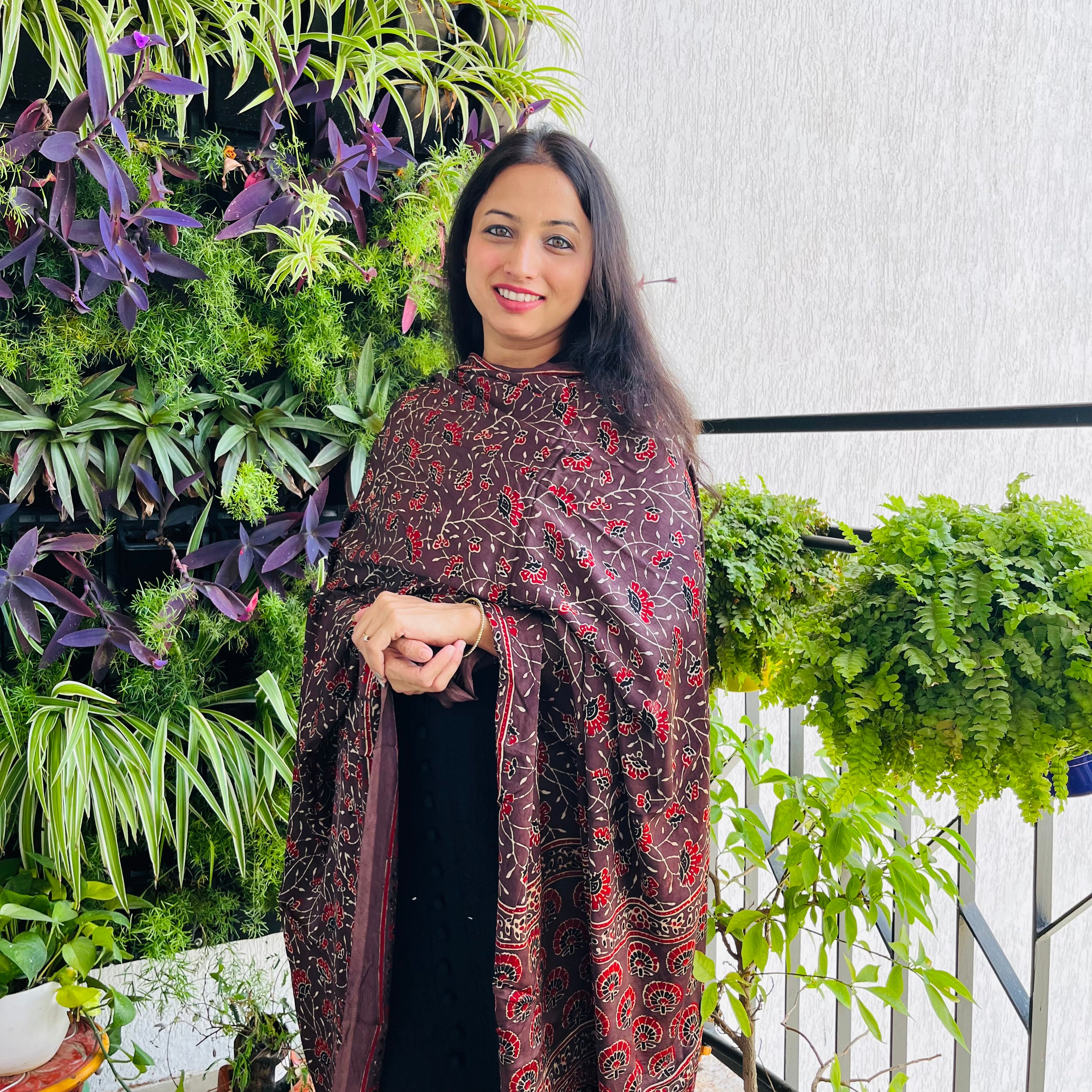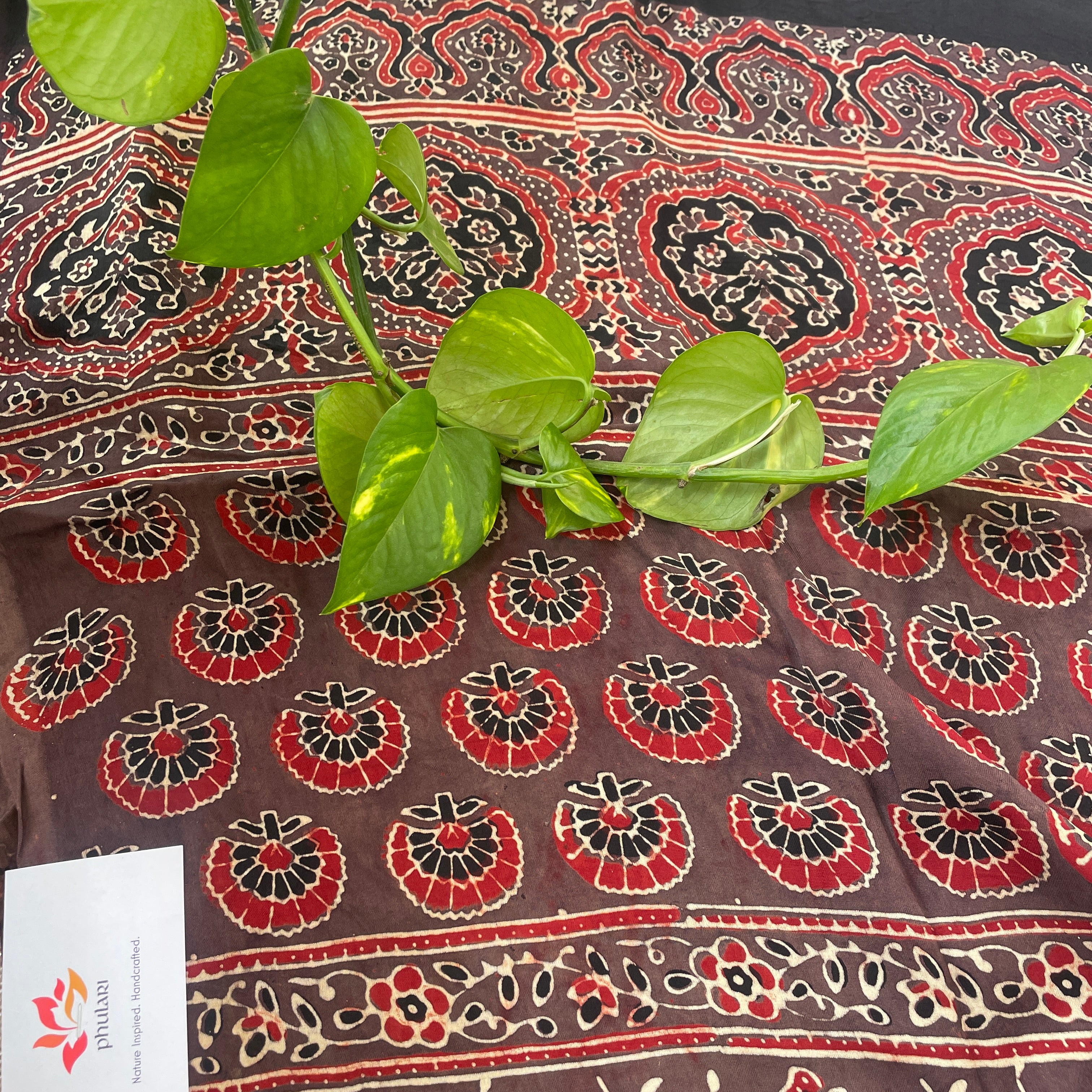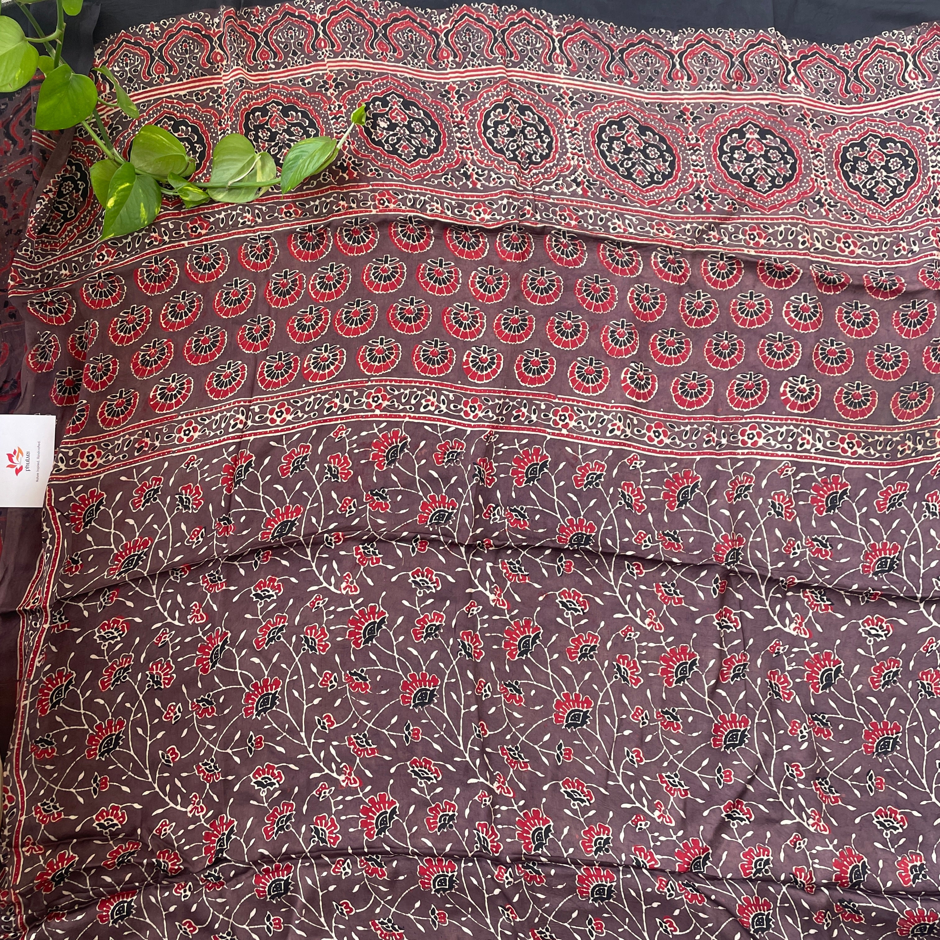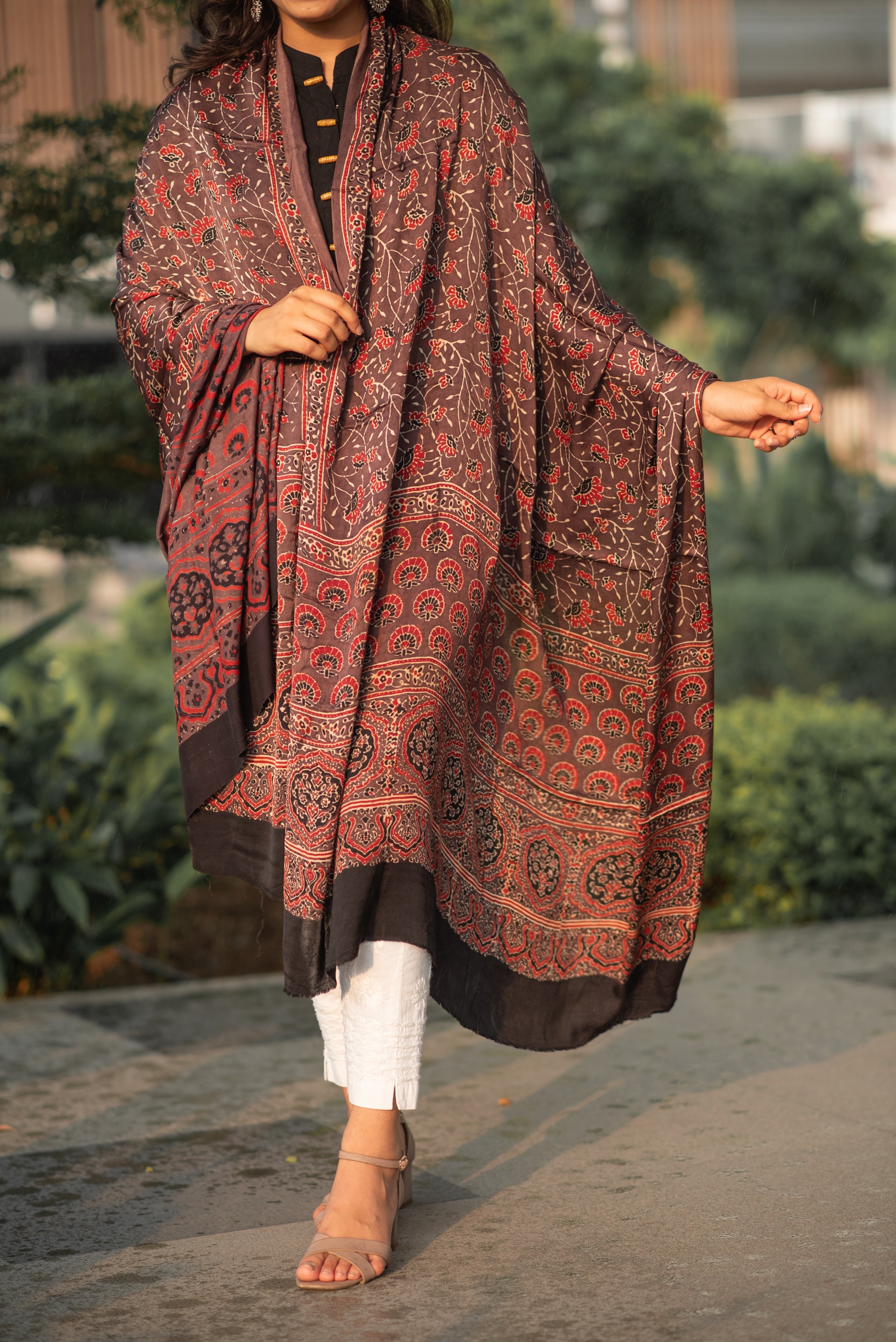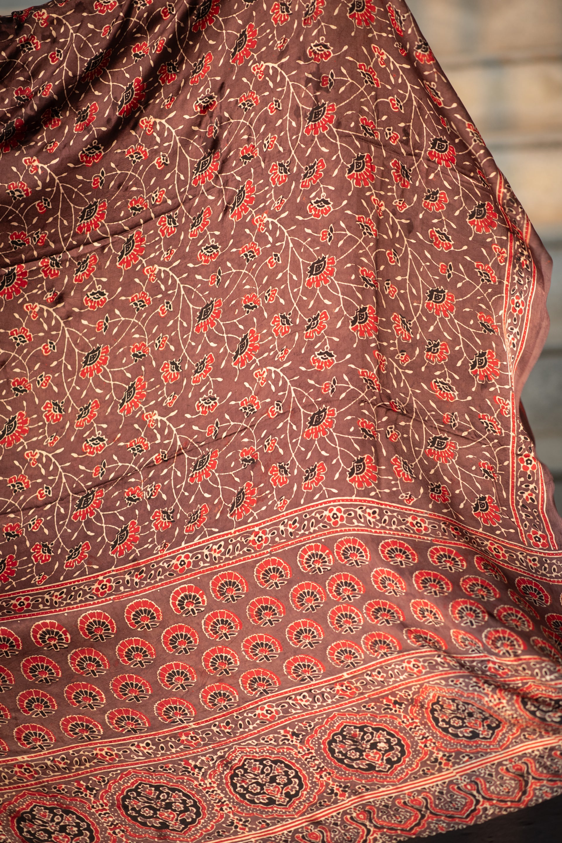 A classic modal silk Ajrakh dupatta to add to your sophistication. Made using natural dyes, this dupatta has beautiful hand-block printed motifs. Club it with your ensemble.