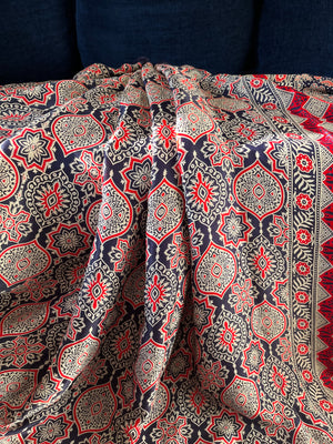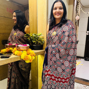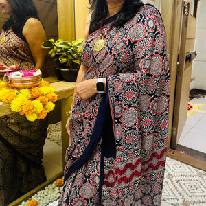 Modal Mashroo Silk Mix Ajrakh Saree - Navy Blue