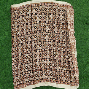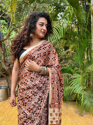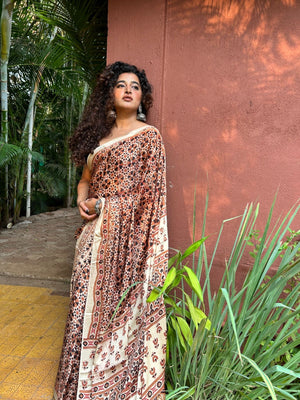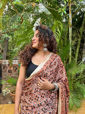Modal Silk Ajrakh Saree is ideal for an attractive look. It has an cream base with brown and black ajrakh hand-block prints all over. Ideal for festivities and occasions. Team it with silver jumkas and you are all ready.