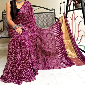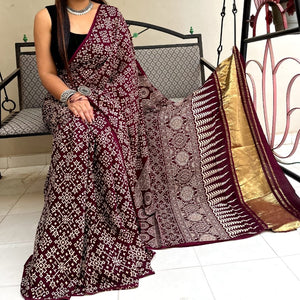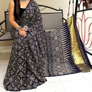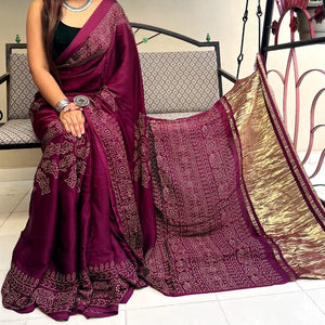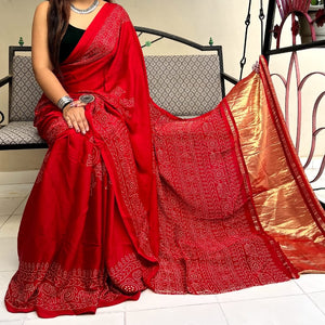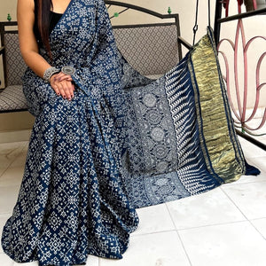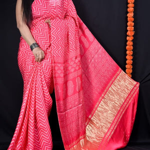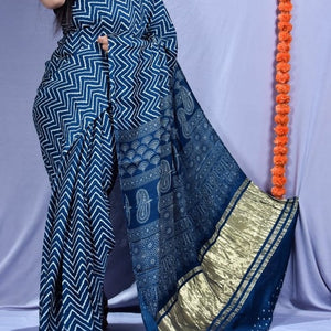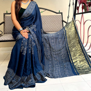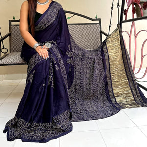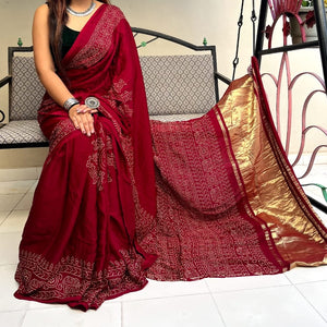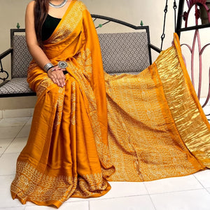 Modal Silk Ajrakh Saree is ideal for an attractive look. This exquisite Ajrakh has Block print all over with beautiful combination of Jari Pallu.