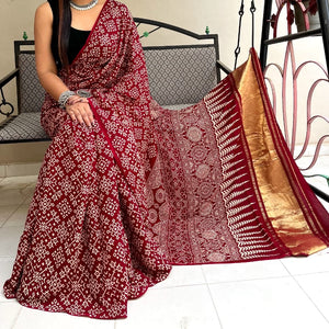 Modal Silk Mashroo Mix Ajrakh Saree - Indigo, Yellow, Red, Maroon ( Customisation available)