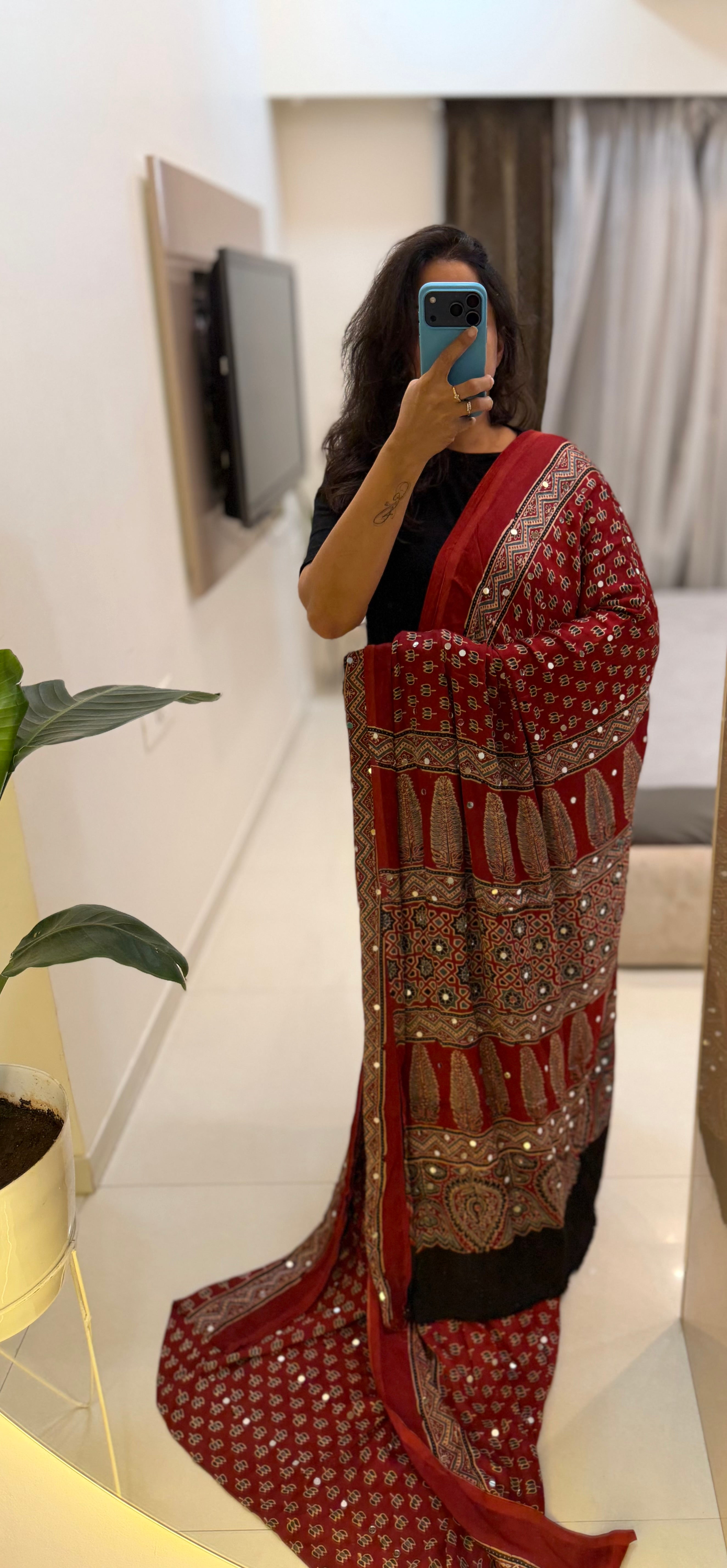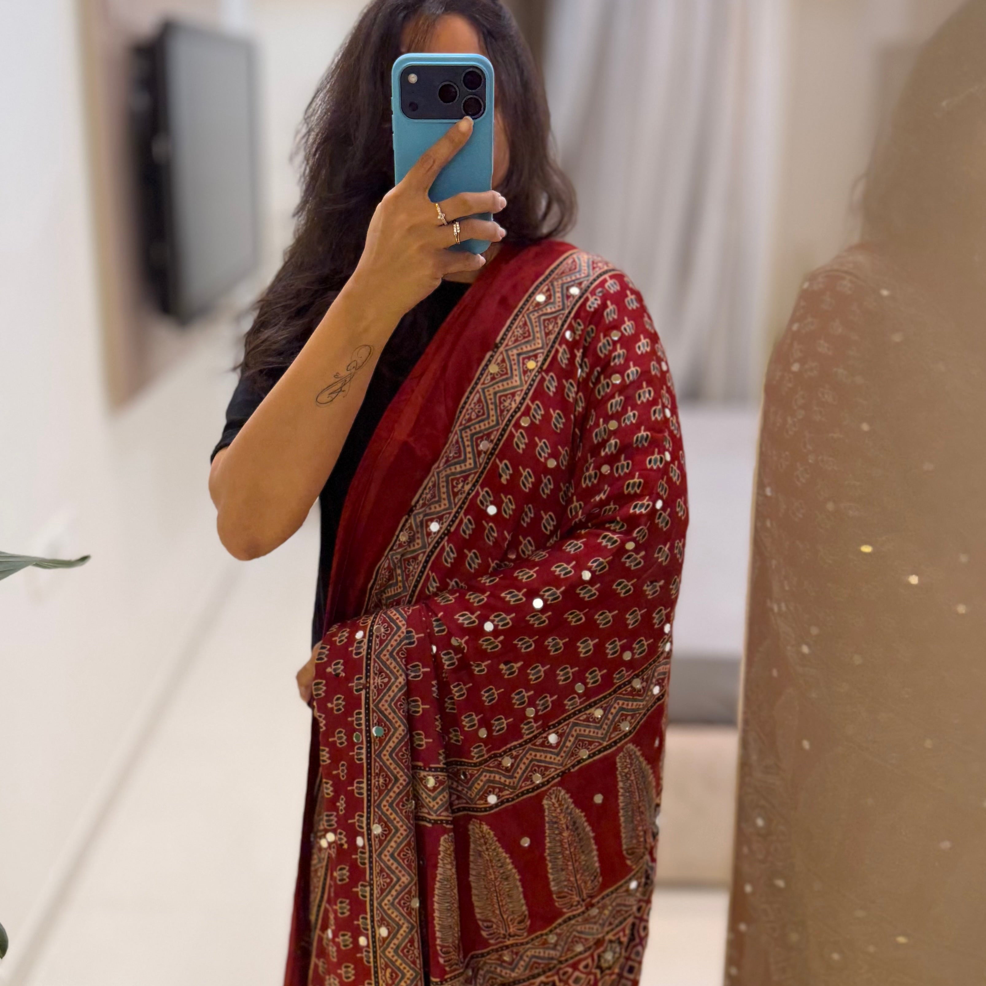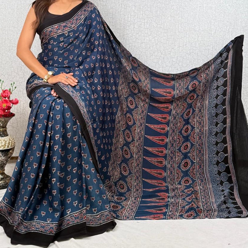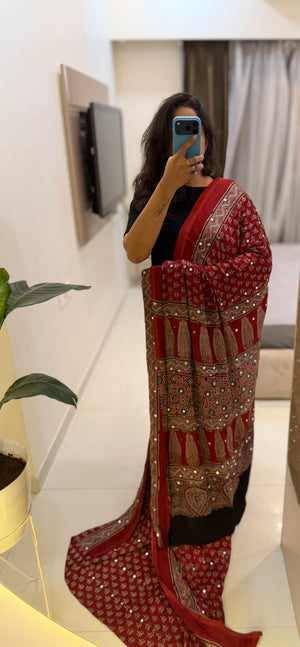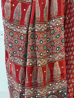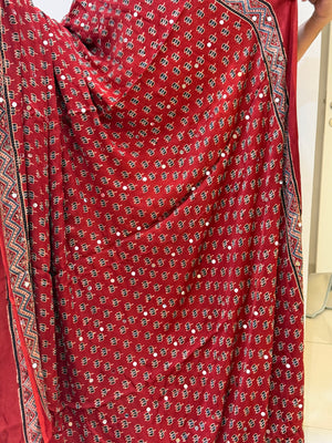 Modal Silk Ajrakh Saree With Natural Dyes and with Mirror Work Red, Indigo, Black and Customisation available