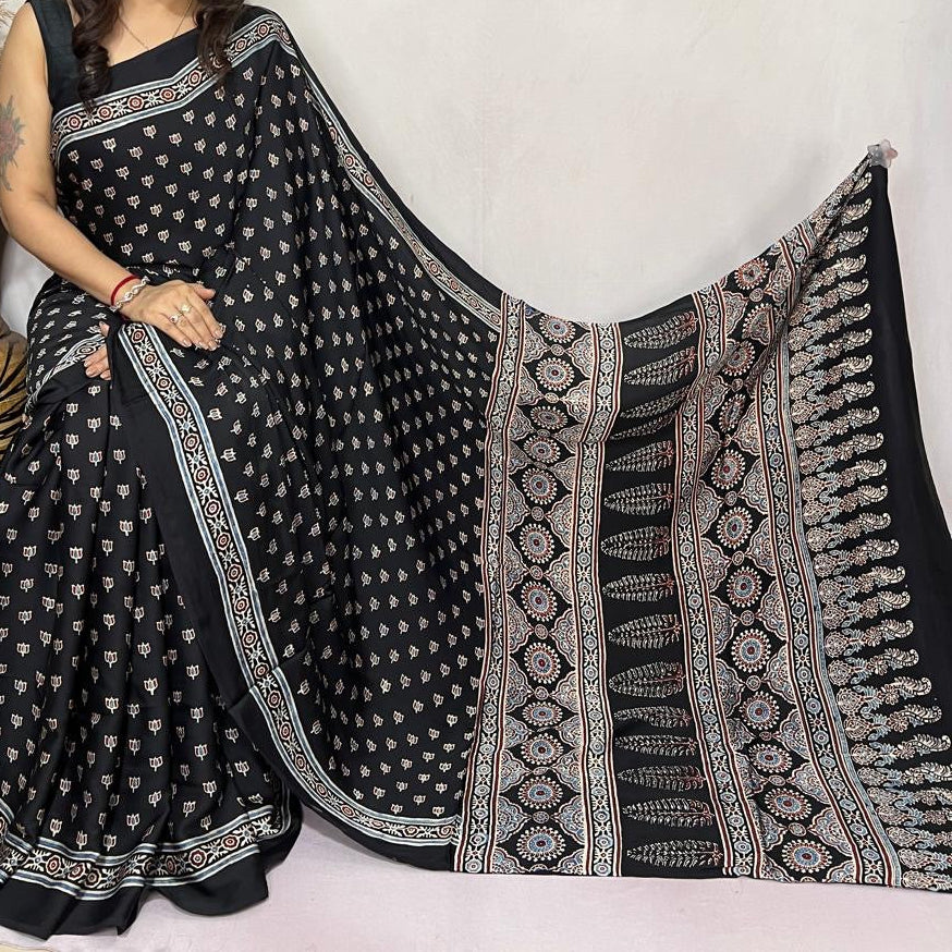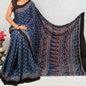 Modal Silk Ajrakh Saree is ideal for an attractive look. It has hand-block prints all over. Ideal for festivities and occasions. Team it with silver jumkas and you are all ready.