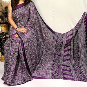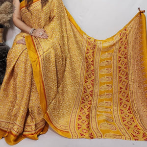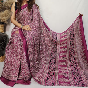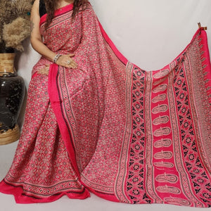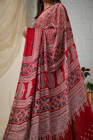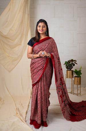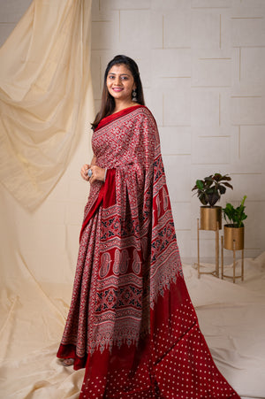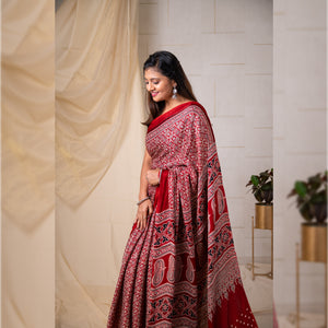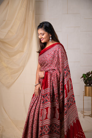 Charismatic patterns on Red, this saree is exclusively designed using Ajrakh starry impressions spread throughout with beautiful multiple Ajrakh patterns .