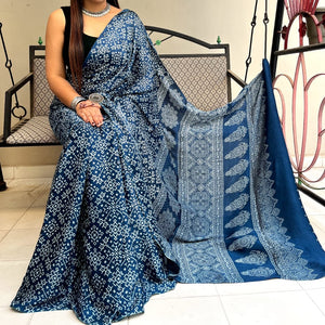 Modal Silk Ajrakh Saree is ideal for an attractive look. It has hand-block prints all over. Ideal for festivities and occasions. Team it with silver jumkas and you are all ready.