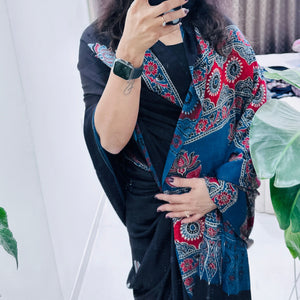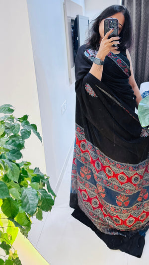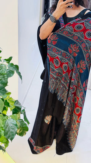 Modal Silk Ajrakh Saree With Natural Dyes - Black and also can be customised in any colour