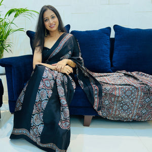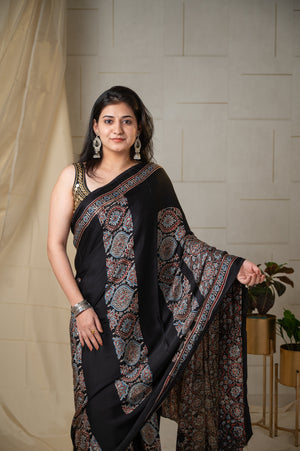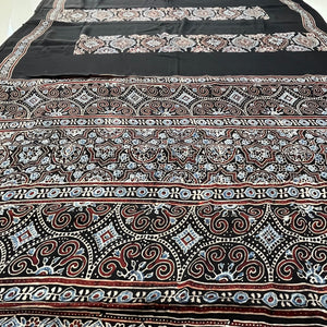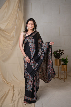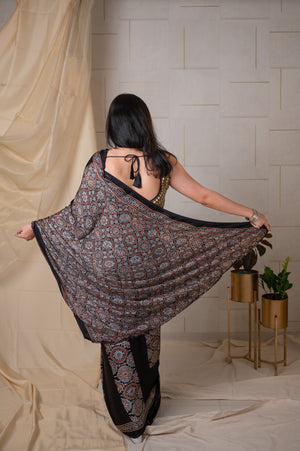 Modal Silk Ajrakh Saree With Natural Dyes - Black With Panels