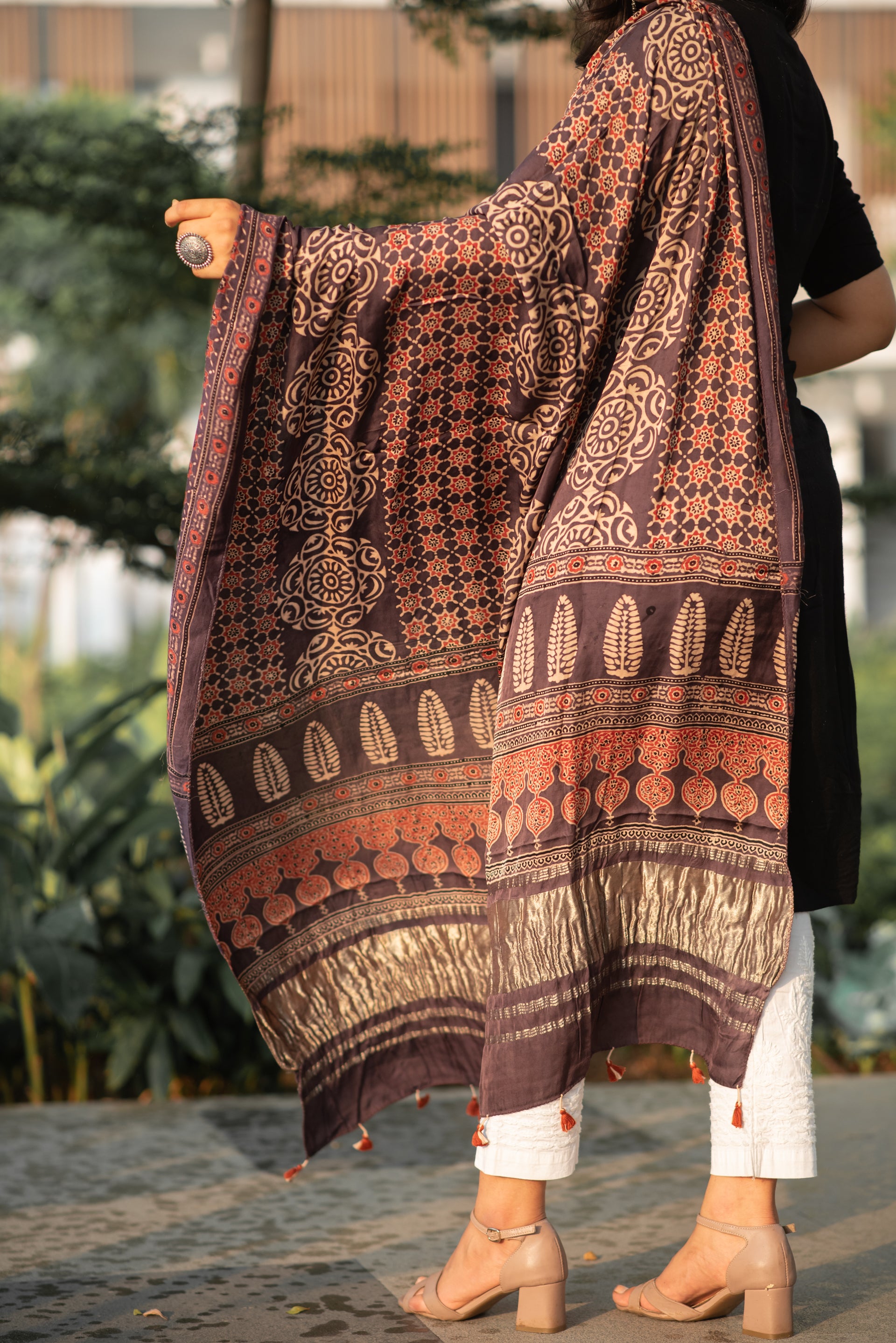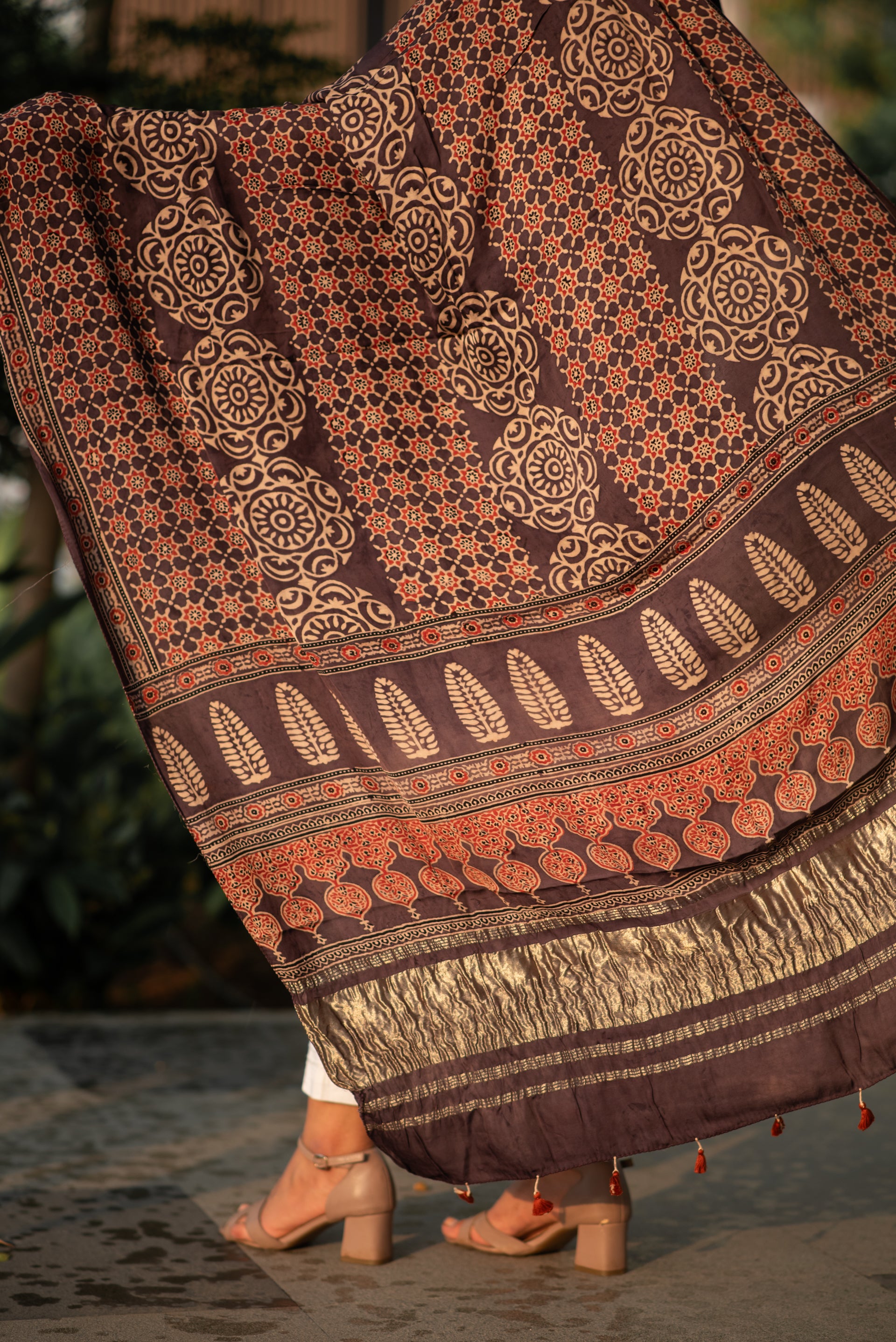Modal Silk Ajrakh Zari Dupatta- Brownish Maroon