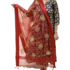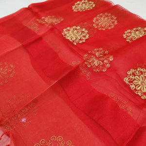 This Organza Embroidered Dupatta is lightweight yet elegant. It has a red base with gold floral design embroidered on the entire fabric. Team it with your lehenga and jewelry for an elevated look.