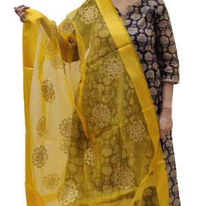 This Organza Embroidered Dupatta is a elegant, stylish and appealing. It has a yellow base with gold floral design embroidered on the all over. Perfect for a traditional celebration. Pair it with a salwar suit for a captivating look.