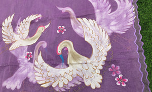 This lightweight organza hand-painted dupatta is a perfect choice for your next gathering. It is unique, appealing and sure to add elegance to your overall look. It is purple with beautiful birds and small flowers painted. This organza dupatta will go well on a white or pink ensemble.