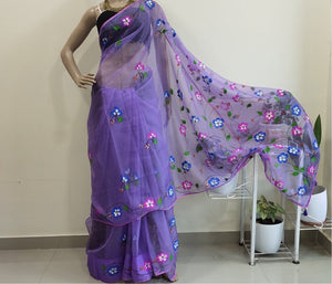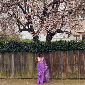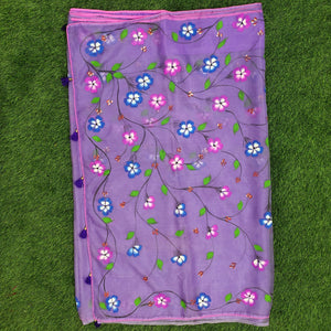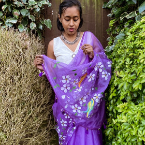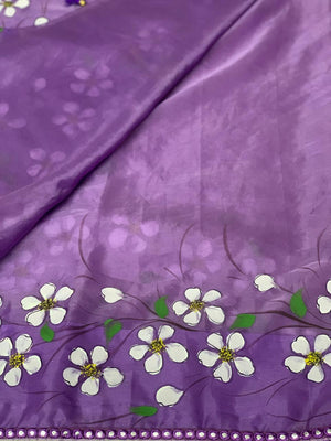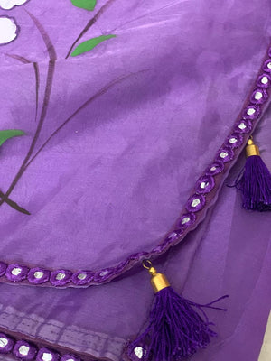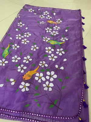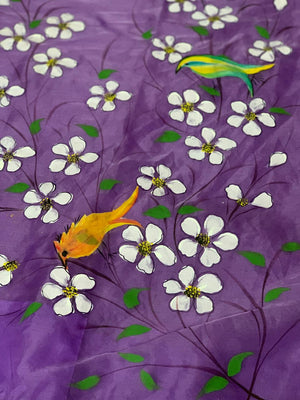 Organza Hand-Painted Saree with Birds & Flowers - Purple