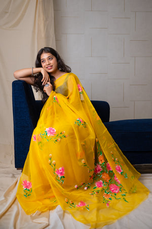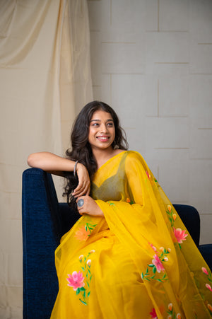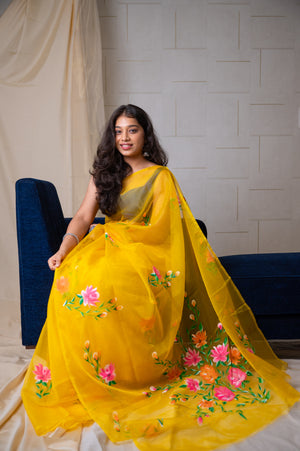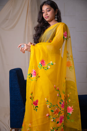 This beautifully Hand-painted Organza Saree is a stellar for festive events and other celebrations. This is a great choice for those who prefer lightweight borderless sarees, in bright colours. Base colour can be customised.
