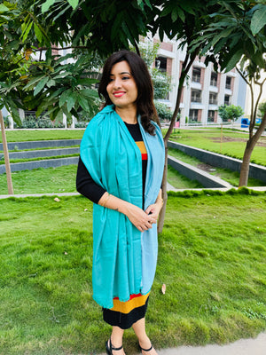 Modal Silk stole for every celebration. It is made of Modal fine silk stole. This stole is blie on one side and sea green on other side. You can wear it whichever way goes with your outfit. Be it ethnic or western, this pashmina fine wool stole is sure to evoke magic.