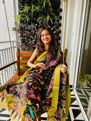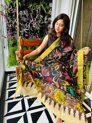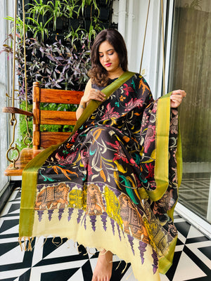 Pen Kalamkari Hand Painted Chinoor Silk Dupatta - Black with Green border