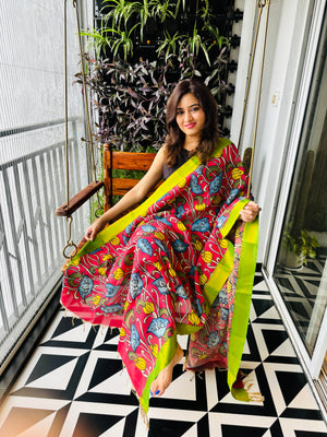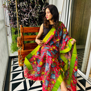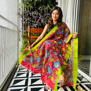 Pen Kalamkari Hand Painted Chinoor Silk Dupatta - Red with Green border
